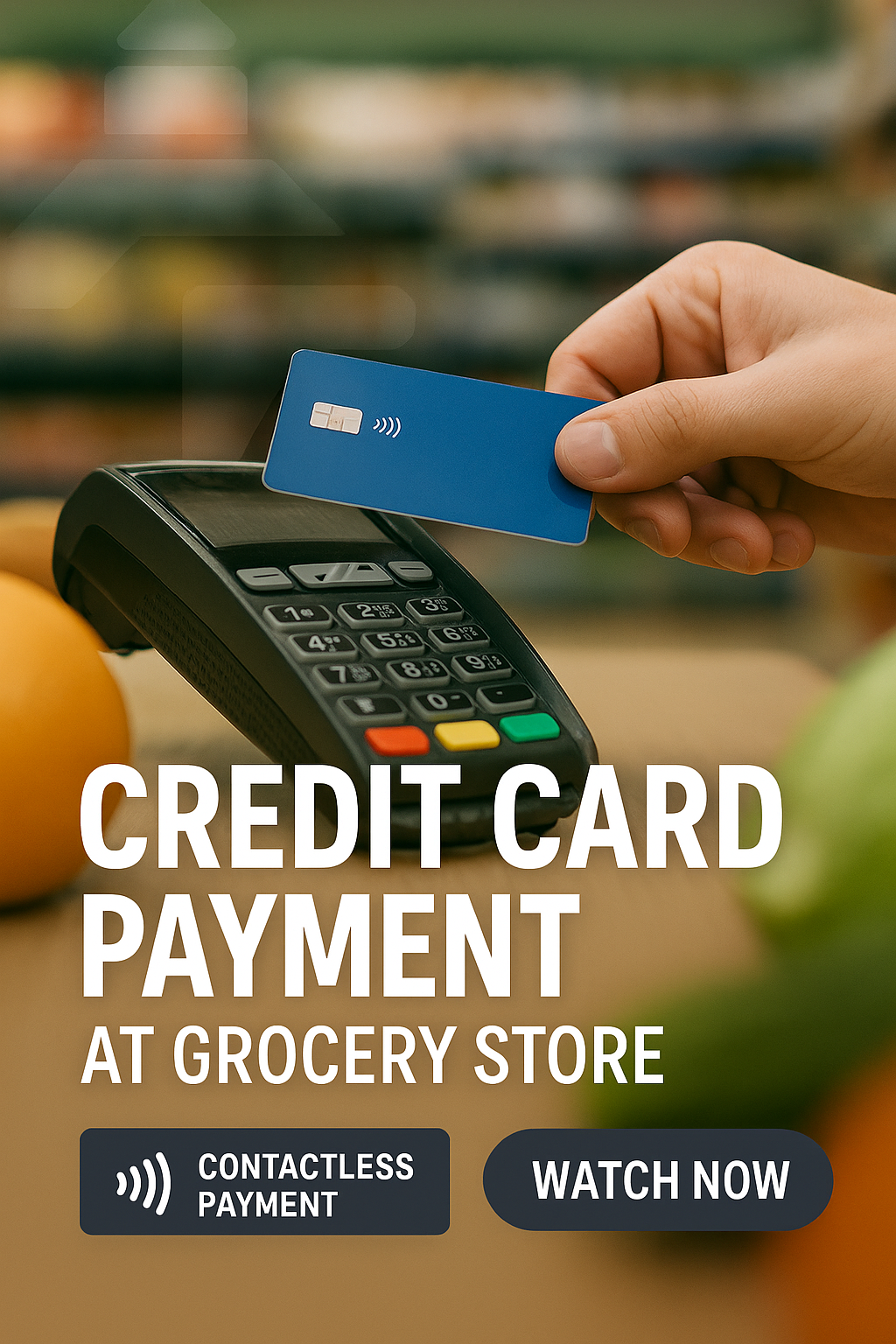 /Collection: /by davooda/Type: PNG/This image showcases a hand using a credit card at a payment terminal in a grocery store setting, emphasizing the convenience of contactless payment. Ideal for financial services or retail promotions.