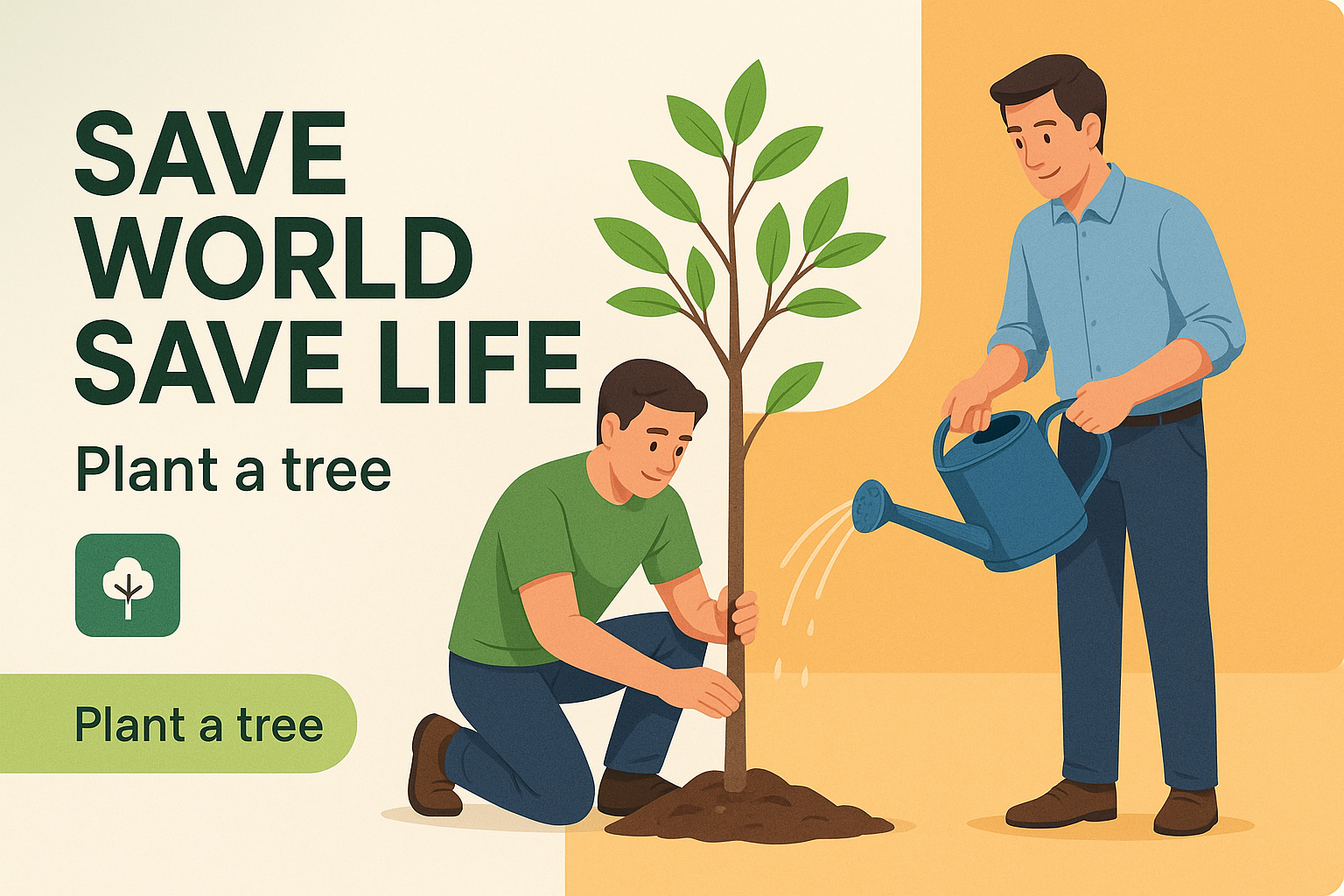 Two men are actively planting a tree and watering it to promote environmental sustainability. The modern design features vibrant colors and clear typography.