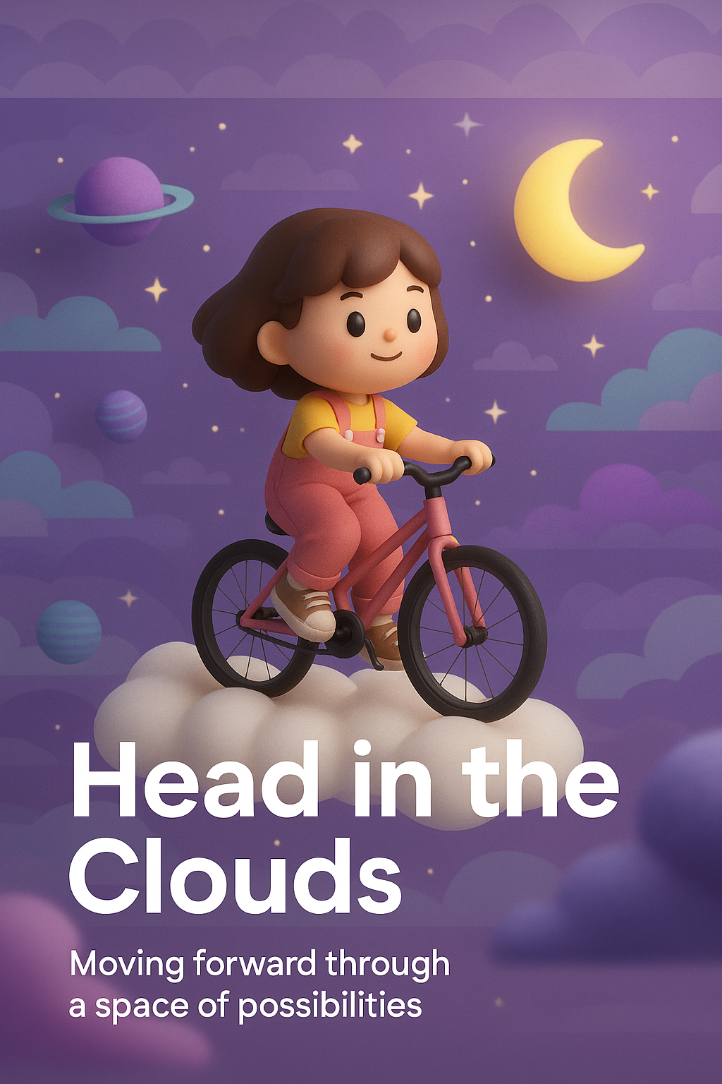 Charming 3D graphic featuring a child riding a bicycle among clouds and celestial elements, perfect for creative projects and children's content.