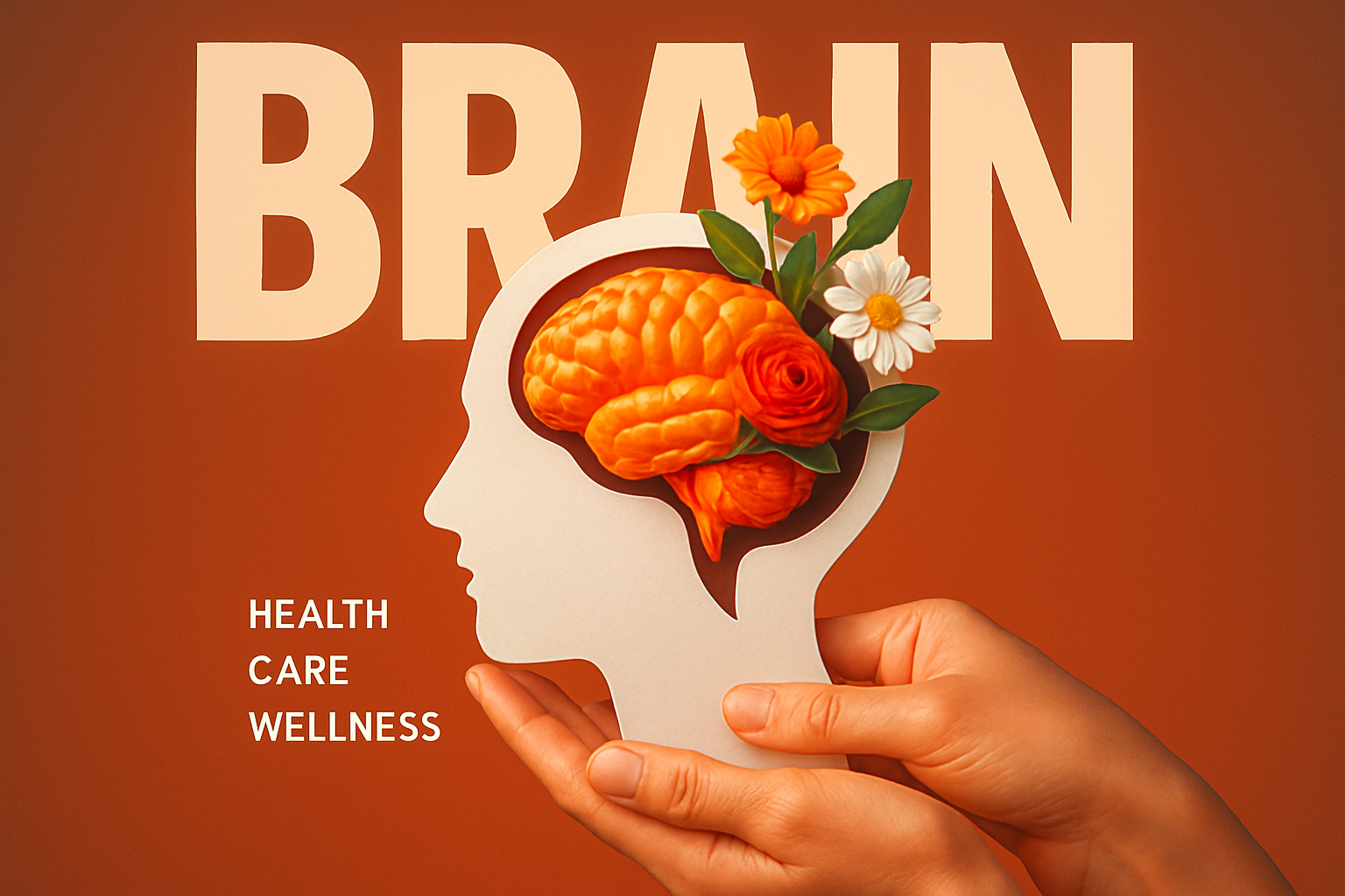 /Collection: /by davooda/Type: PNG/A pair of hands holds a paper silhouette of a head with a vibrant brain made of flowers. The background features a warm gradient, emphasizing themes of self-care and positive thinking.