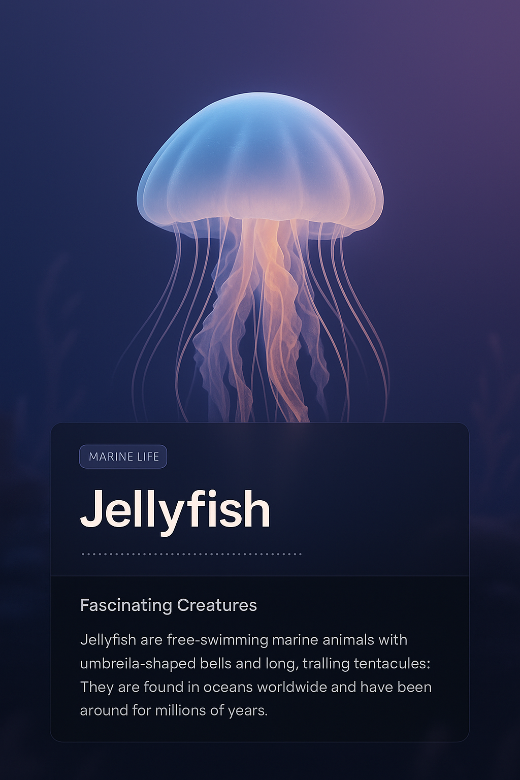 /Collection: /by davooda/Type: PNG/A captivating 3D jellyfish illustration featuring a smooth gradient background. The design includes a dark information panel with text detailing marine life, creating a cohesive visual experience.