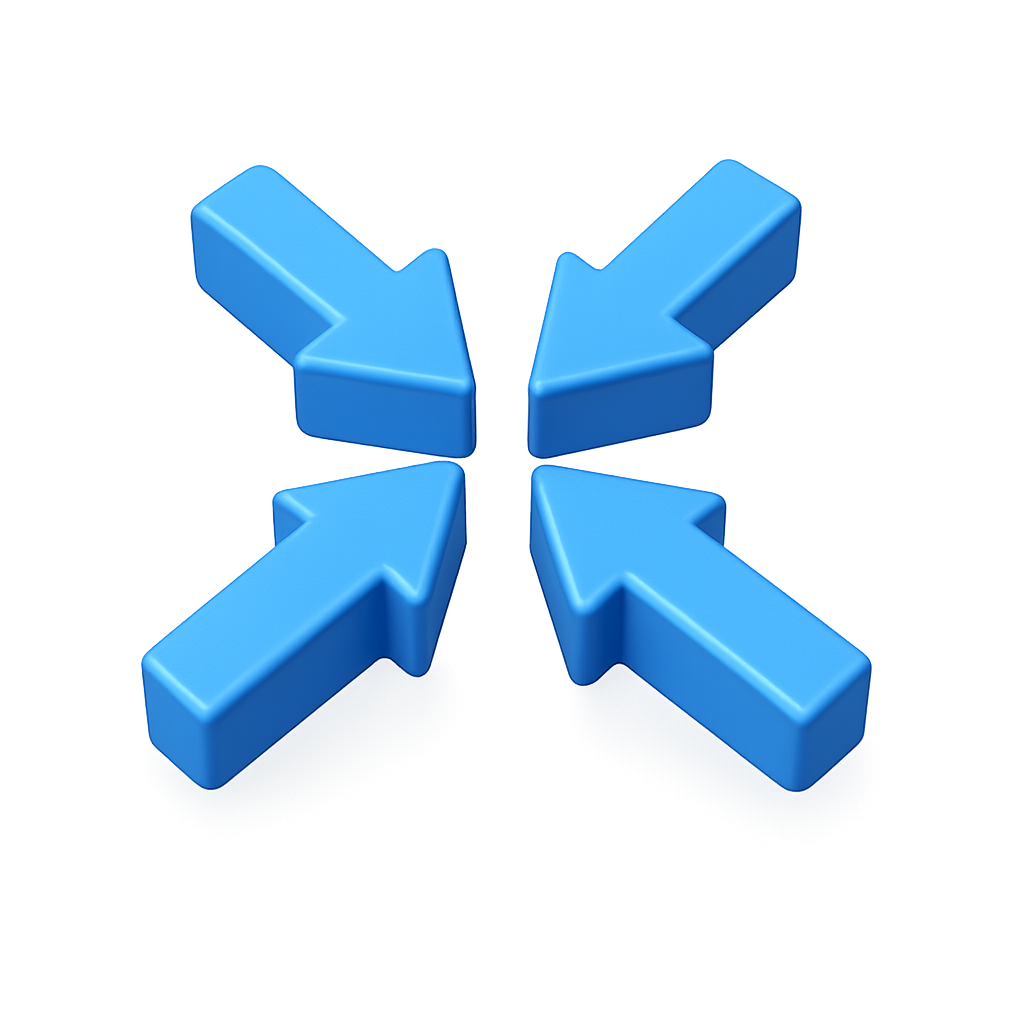 A modern 3D icon featuring four blue arrows pointing inward, designed with a glossy finish and isometric perspective on a transparent background.
