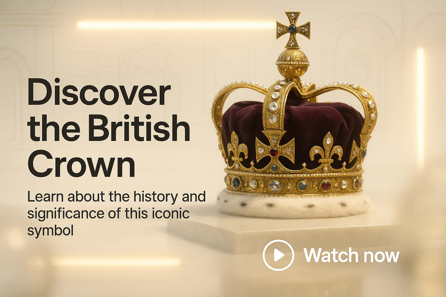 Visually engaging promotional graphic featuring the British crown, inviting viewers to learn about its history and significance, ideal for educational content marketing.