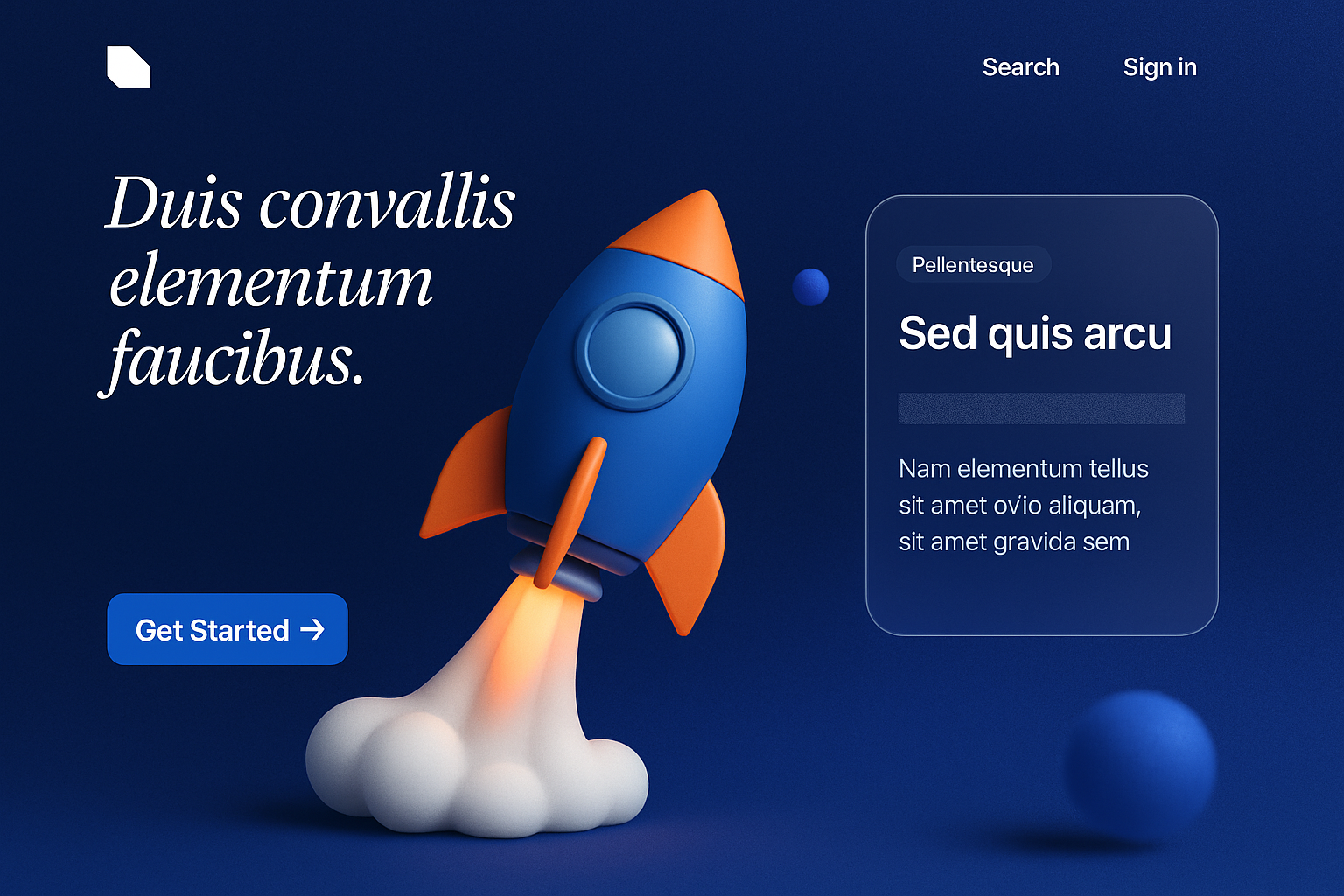 /Collection: /by davooda/Type: PNG/A visually striking 3D landing page featuring a rocket launching against a dark blue gradient background. Includes a prominent call-to-action button and styled text elements.