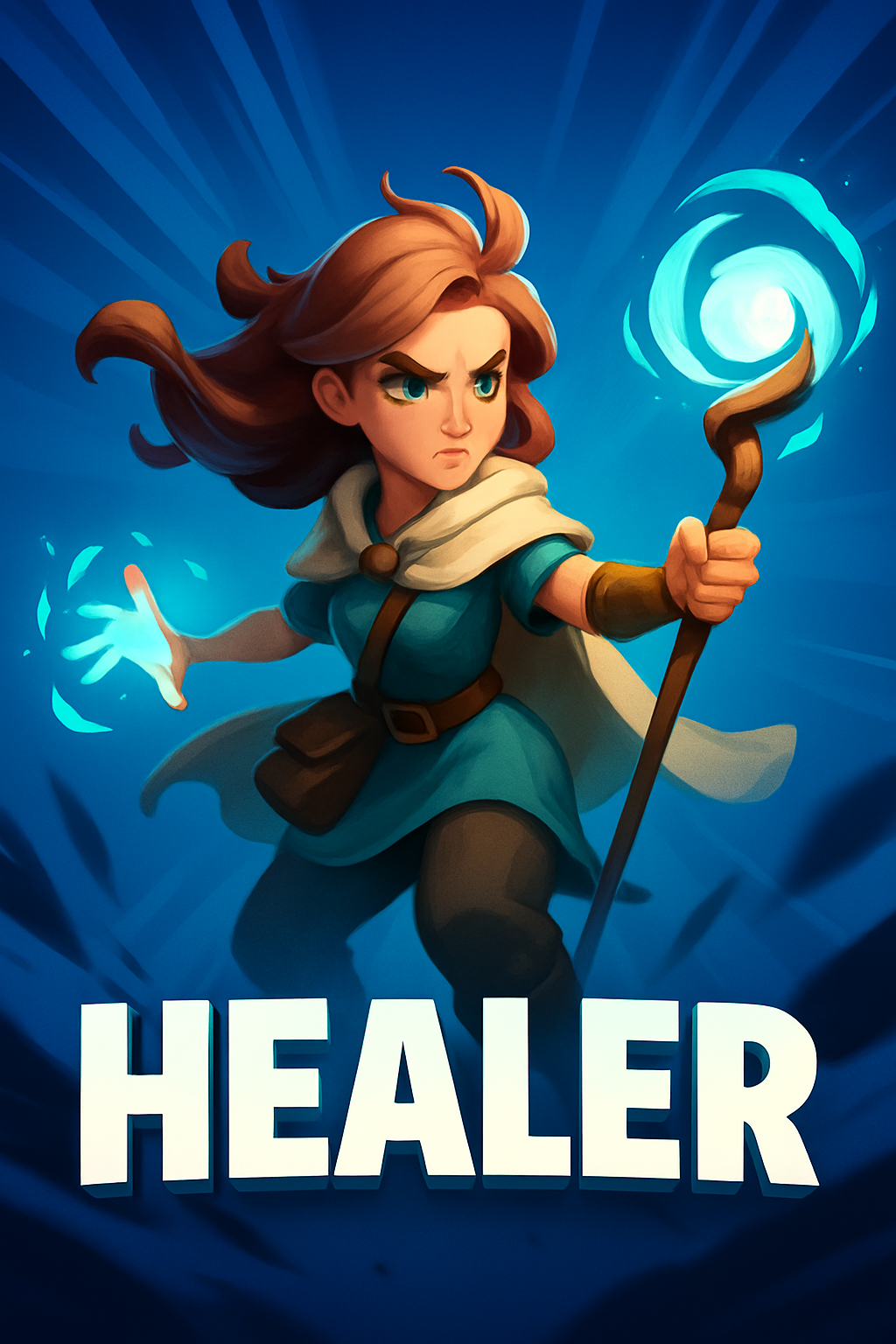 A striking illustration of a fierce healer character brandishing a staff, surrounded by magical energy. The background features dynamic lines radiating outward, enhancing the action-packed scene.