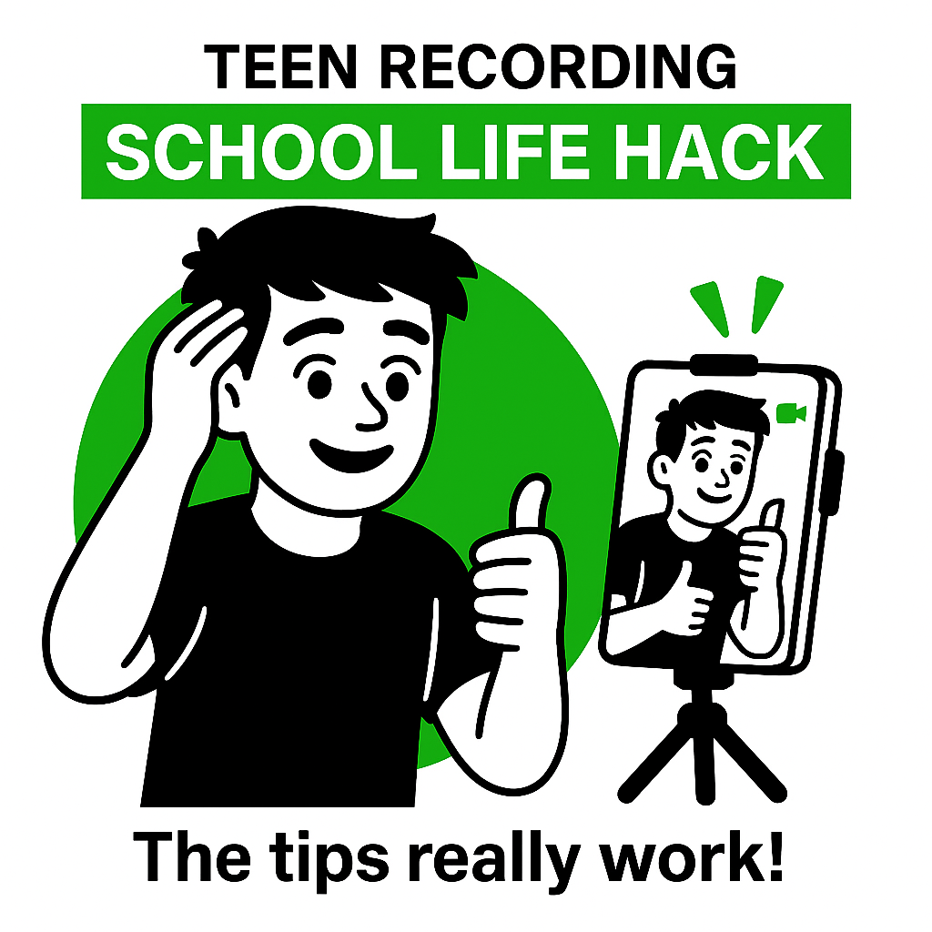 Illustrative graphic featuring a teen recording a school life hack with a smartphone, designed for educational content sharing on social media.