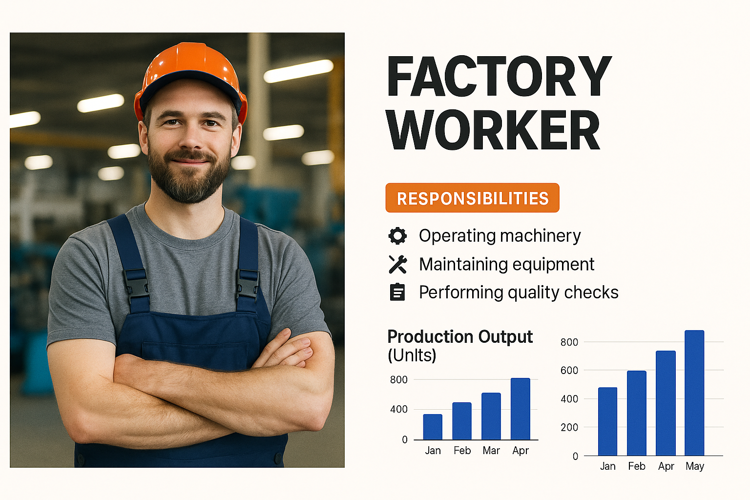 /Collection: /by davooda/Type: PNG/Professional infographic highlighting the responsibilities and production output of a factory worker, featuring clear visuals and data representation suitable for HR or training materials.