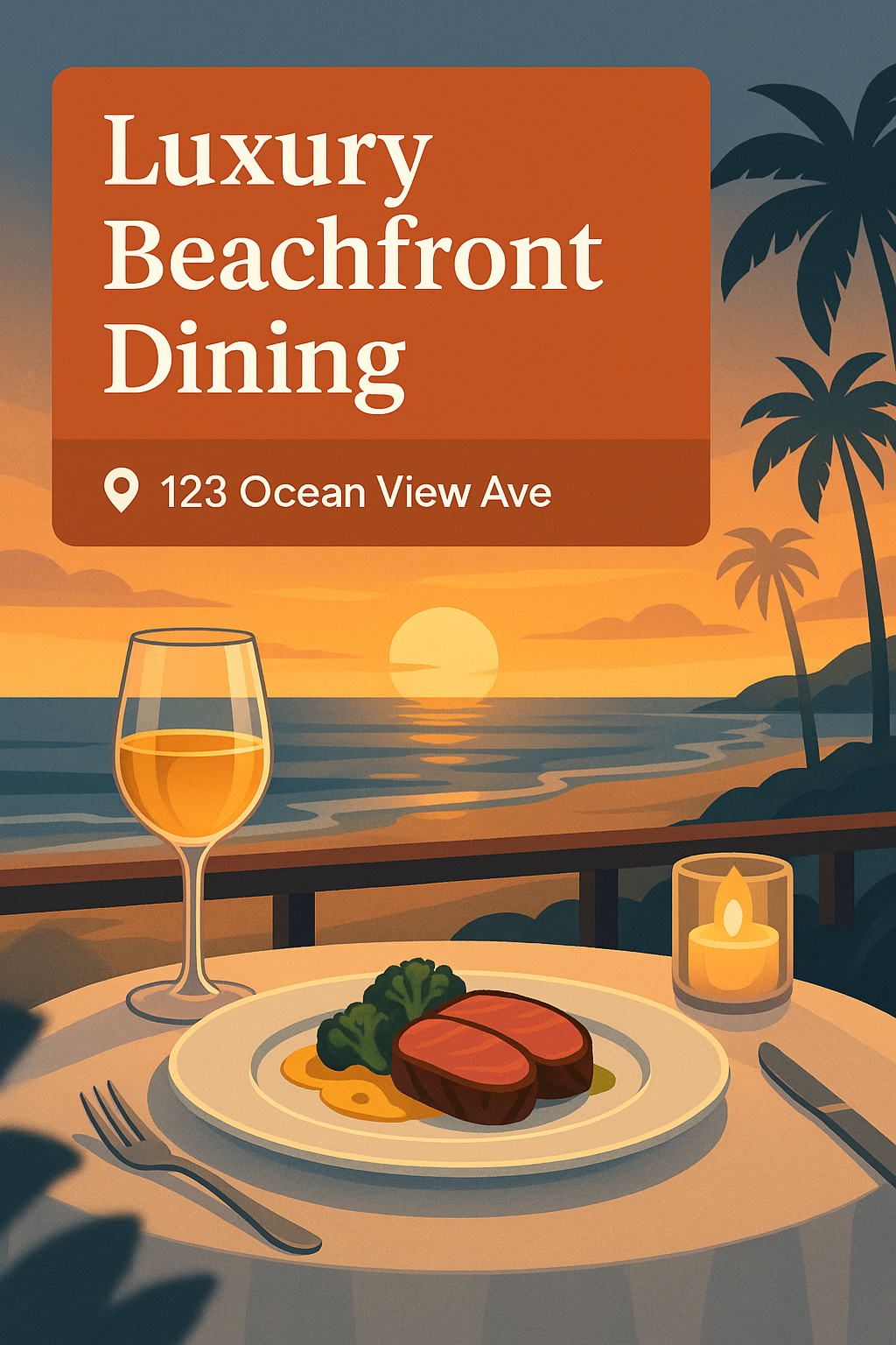 A visually appealing promotional graphic showcasing luxury dining by the beach, featuring a sunset background and elegant table setting, perfect for restaurant advertising.