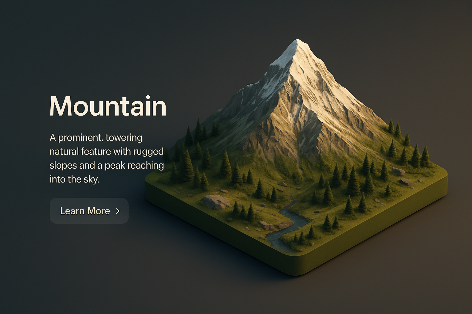 /Collection: /by davooda/Type: PNG/A detailed 3D illustration of a mountain with rugged slopes and a peak. The scene features a river and trees, set against a dark gradient background, with text elements for context.