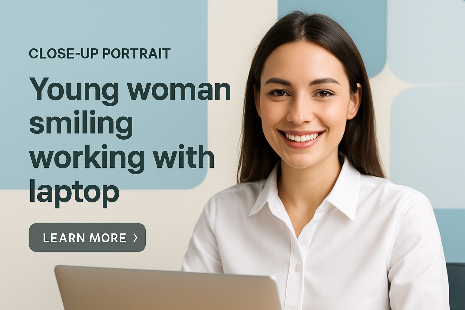 /Collection: /by davooda/Type: PNG/A close-up portrait of a young woman smiling while working on a laptop in a modern office environment. The background features geometric blocks in bright colors, enhancing the professional atmosphere.