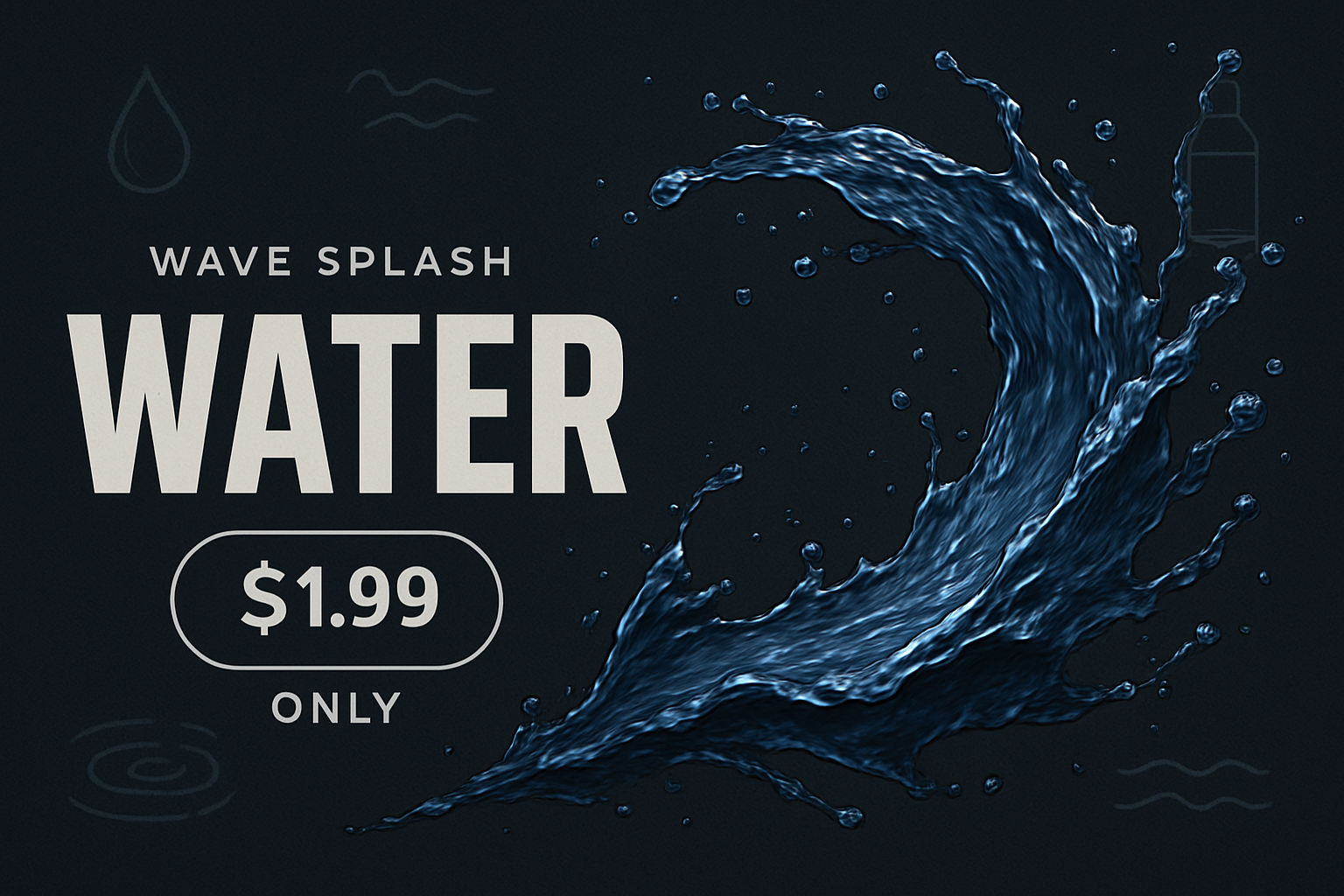 /Collection: /by davooda/Type: PNG/An eye-catching advertisement featuring a realistic water wave splash on a textured dark background. Bold typography highlights the product's name and price, creating an energetic appeal.