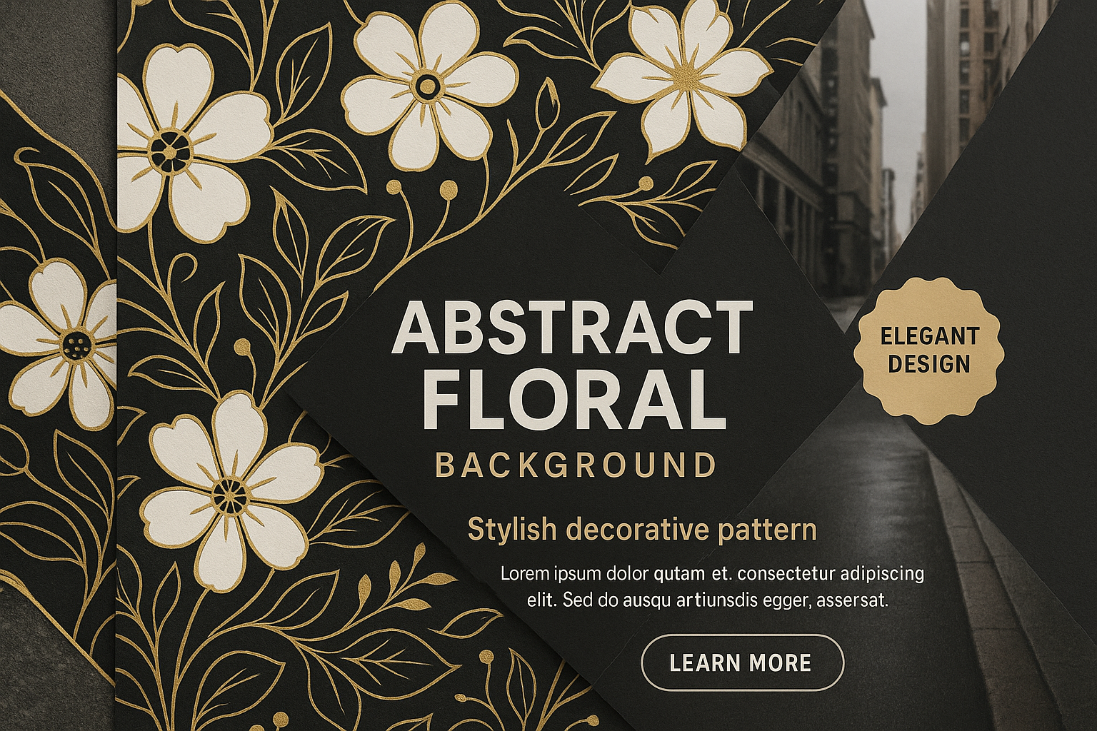 /Collection: /by davooda/Type: PNG/A sophisticated abstract floral pattern featuring black, gold, and white elements. Includes geometric shapes and a layered composition with a realistic aesthetic.