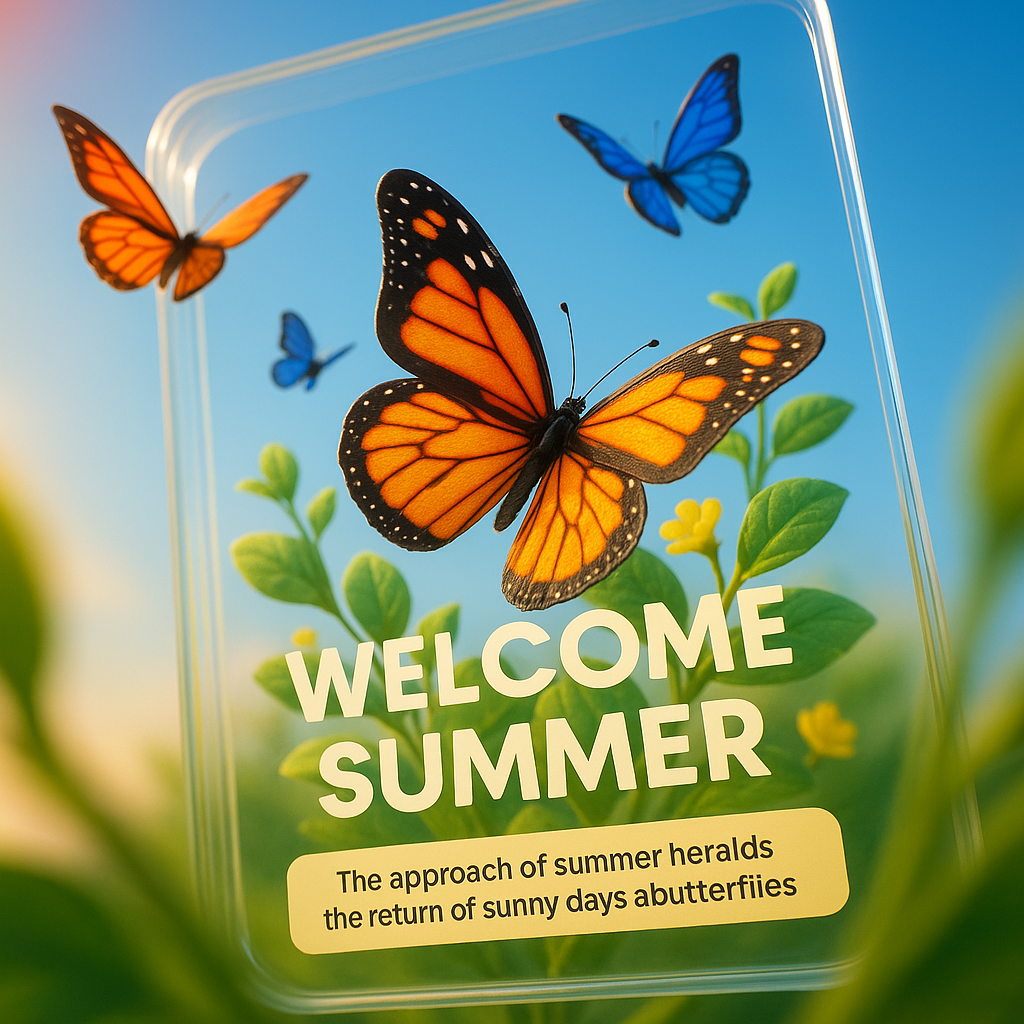A visually appealing summer-themed graphic showcasing colorful butterflies and lush greenery. Perfect for seasonal promotions or social media posts celebrating summer.