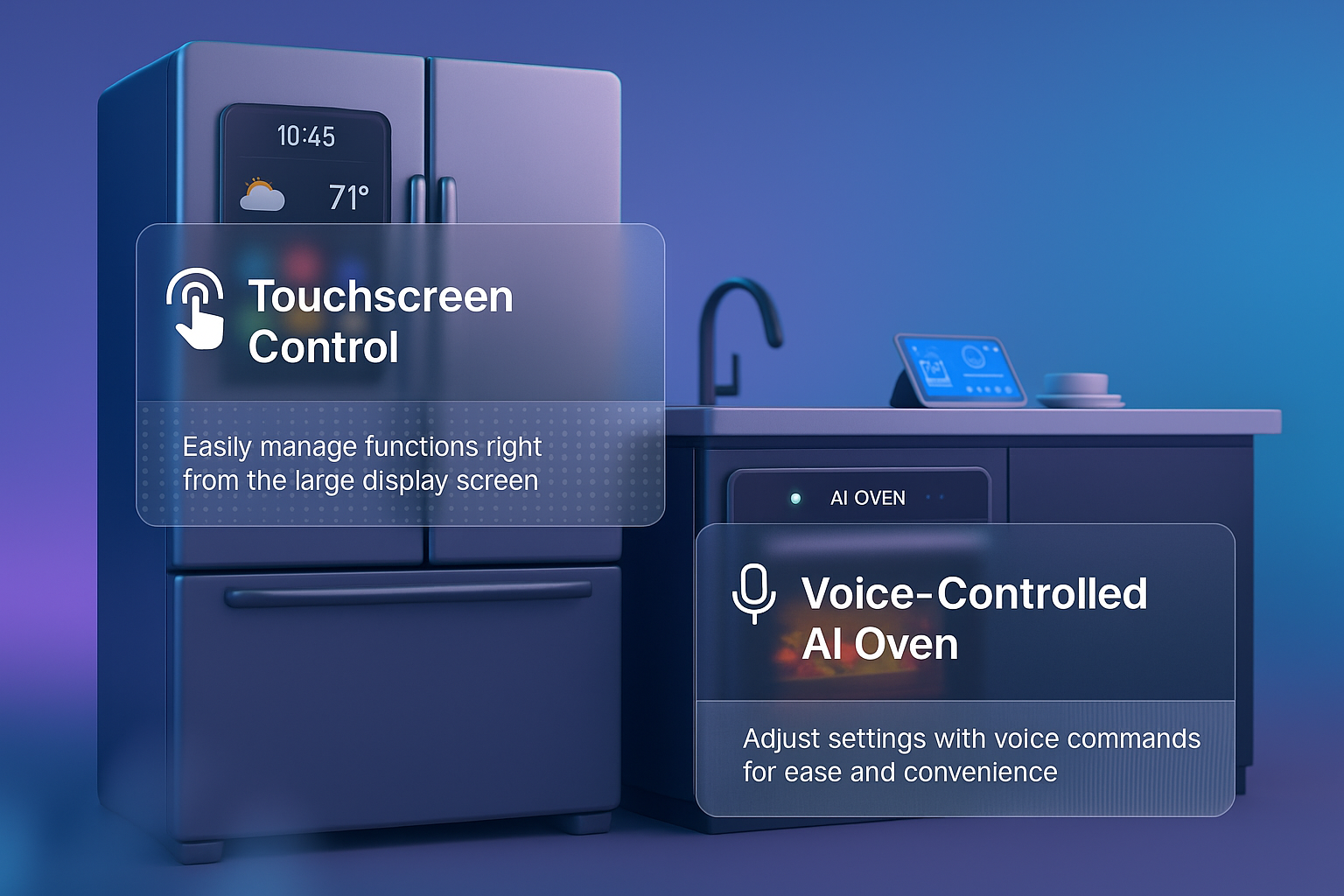 /Collection: /by davooda/Type: PNG/A modern kitchen featuring smart appliances, including a touchscreen refrigerator and voice-controlled oven. The design emphasizes technology integration in home cooking.