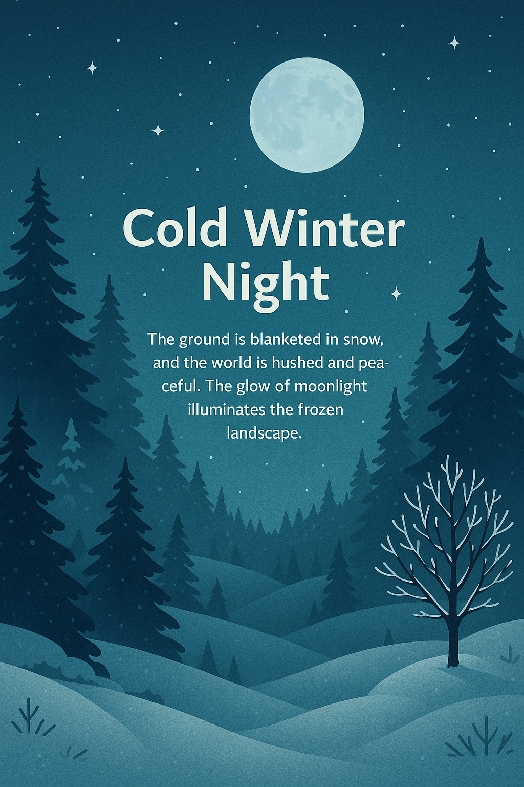 Stylized illustration depicting a tranquil winter night with snow-covered trees and a glowing moon, perfect for seasonal promotions or calming decor.