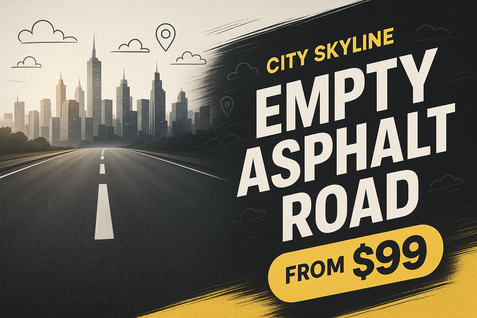 /Collection: /by davooda/Type: PNG/This advertisement showcases an empty asphalt road leading towards a modern city skyline. The design features bold typography and a clean layout, emphasizing the price and product.