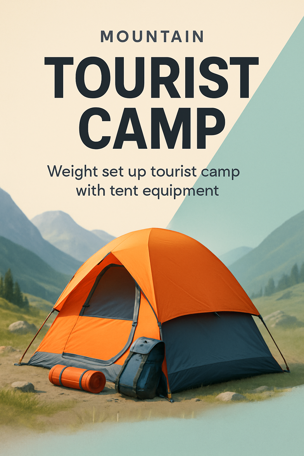 /Collection: /by davooda/Type: PNG/A vibrant advertisement showcasing a tourist camp in the mountains. The orange tent is prominently displayed in the foreground, set against a dynamic, contrasting background.