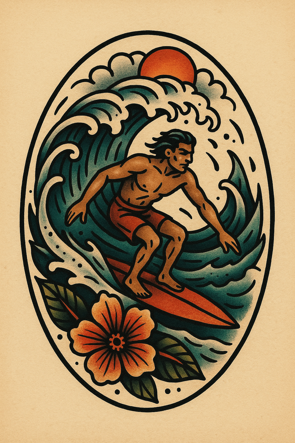 This image features a vintage-style tattoo art of a surfer riding waves, with a sun and floral elements. Ideal for surf culture enthusiasts and tattoo art.