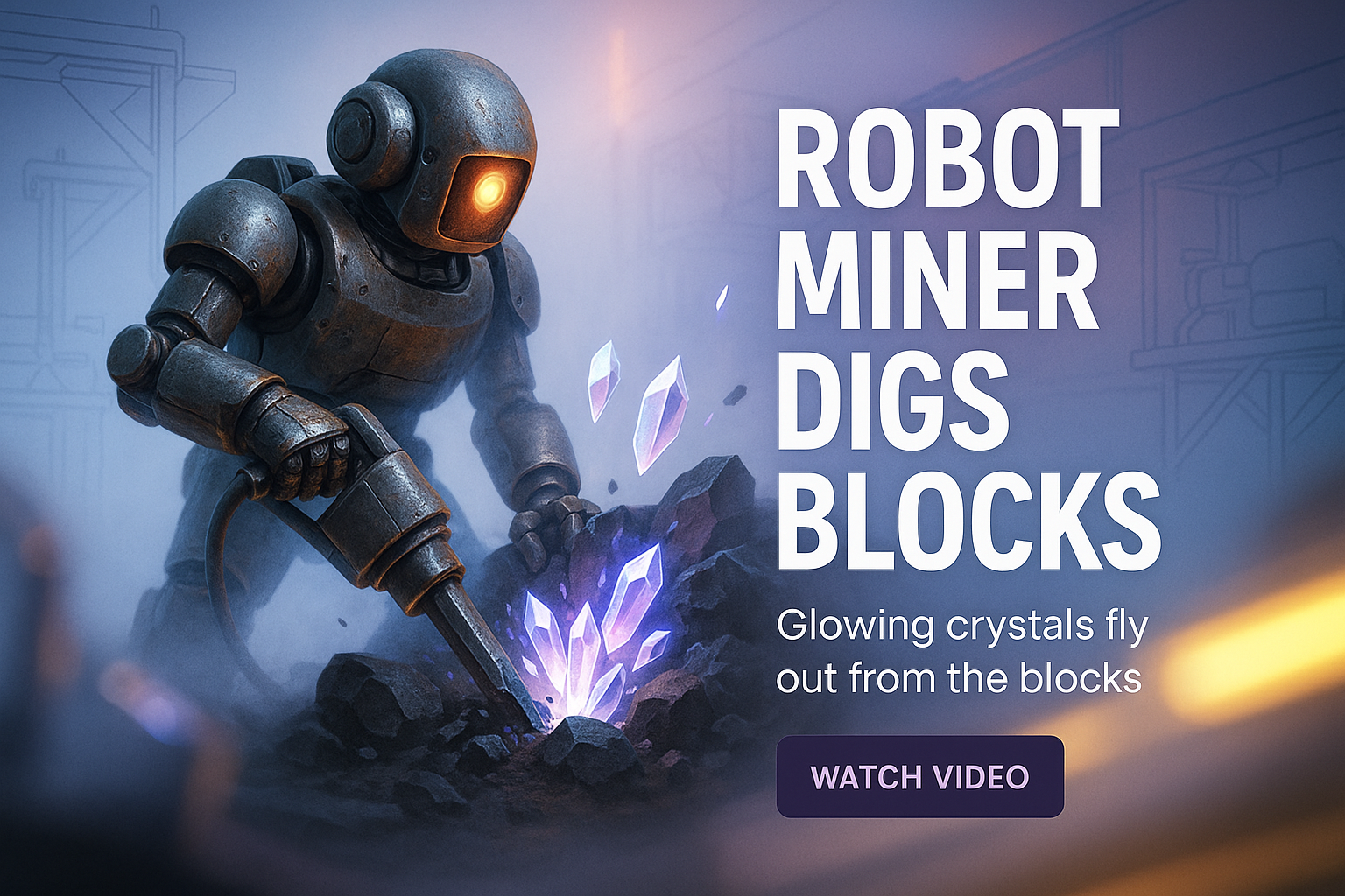 Dynamic digital artwork depicting a robot miner excavating glowing crystals from blocks, ideal for gaming or technology-related promotional content.