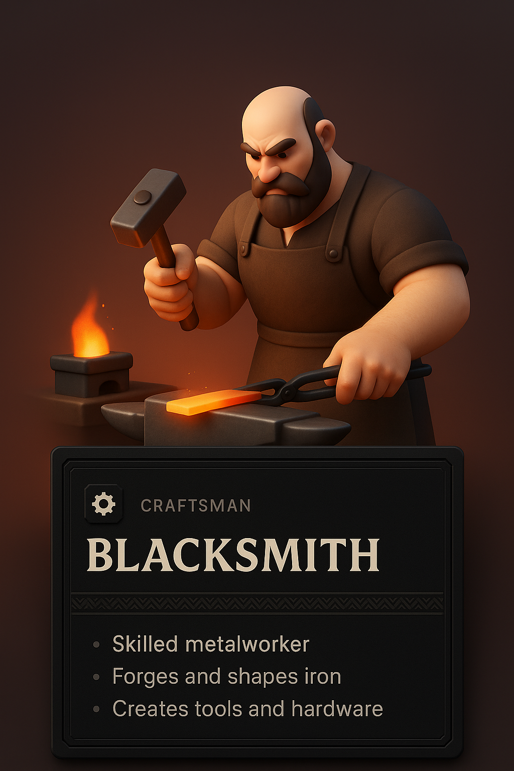 /Collection: /by davooda/Type: PNG/A detailed 3D illustration of a blacksmith working with molten metal. The design includes a dark panel with text describing the craft, showcasing the skills and tools of the trade.