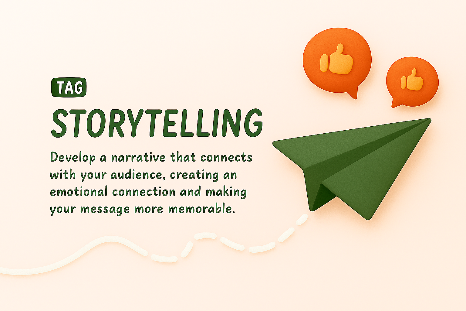 A vibrant graphic featuring a paper airplane symbolizing storytelling, with expressive thumbs-up icons. Ideal for marketing and communication themes.