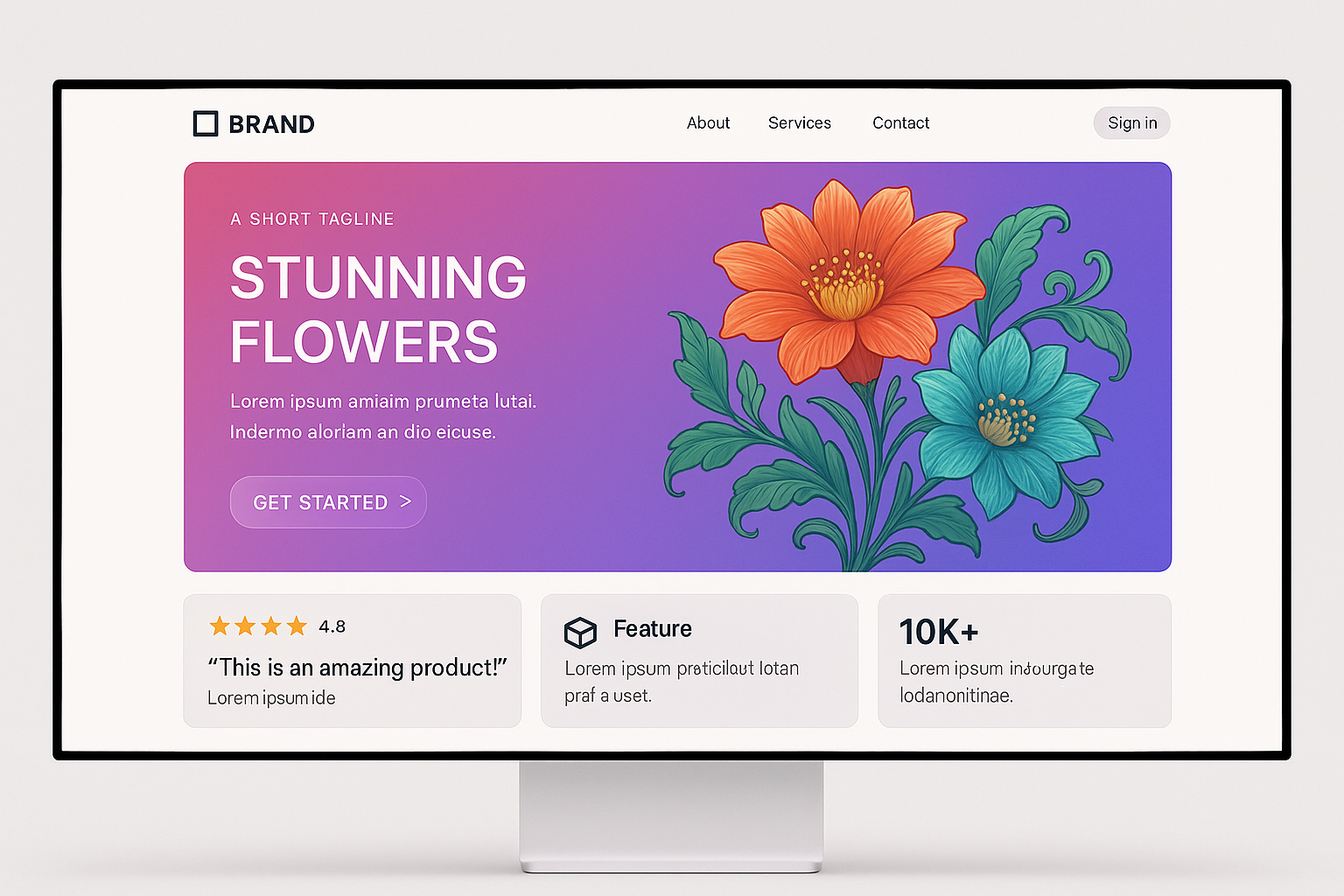 /Collection: /by davooda/Type: PNG/A sleek, modern landing page design featuring vibrant floral illustrations and a dynamic gradient background. It includes interactive elements like buttons and ratings.