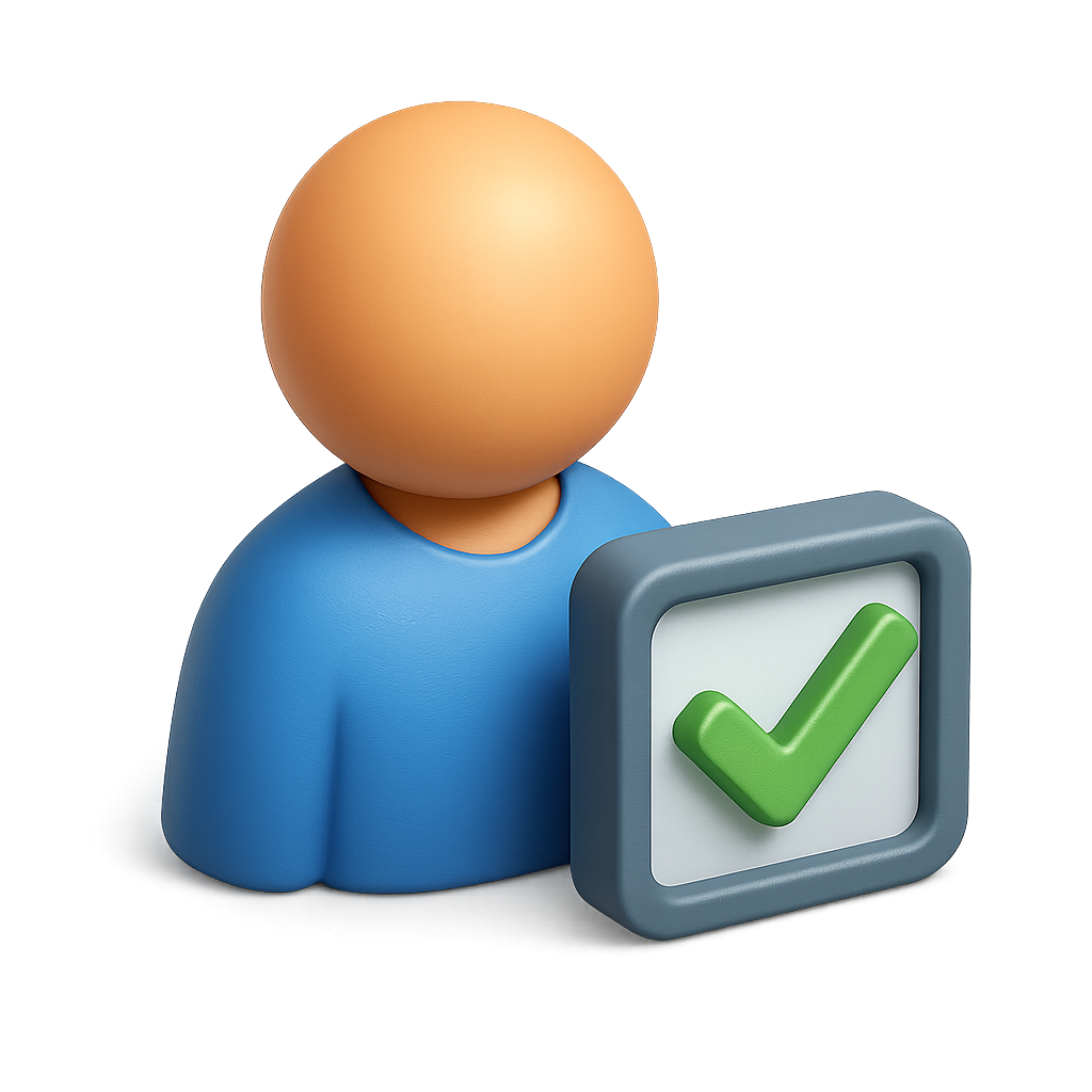 A 3D icon featuring a person-like figure in blue and a green checkmark within a grey square. The design is isometric with a transparent background, creating a modern and engaging look.