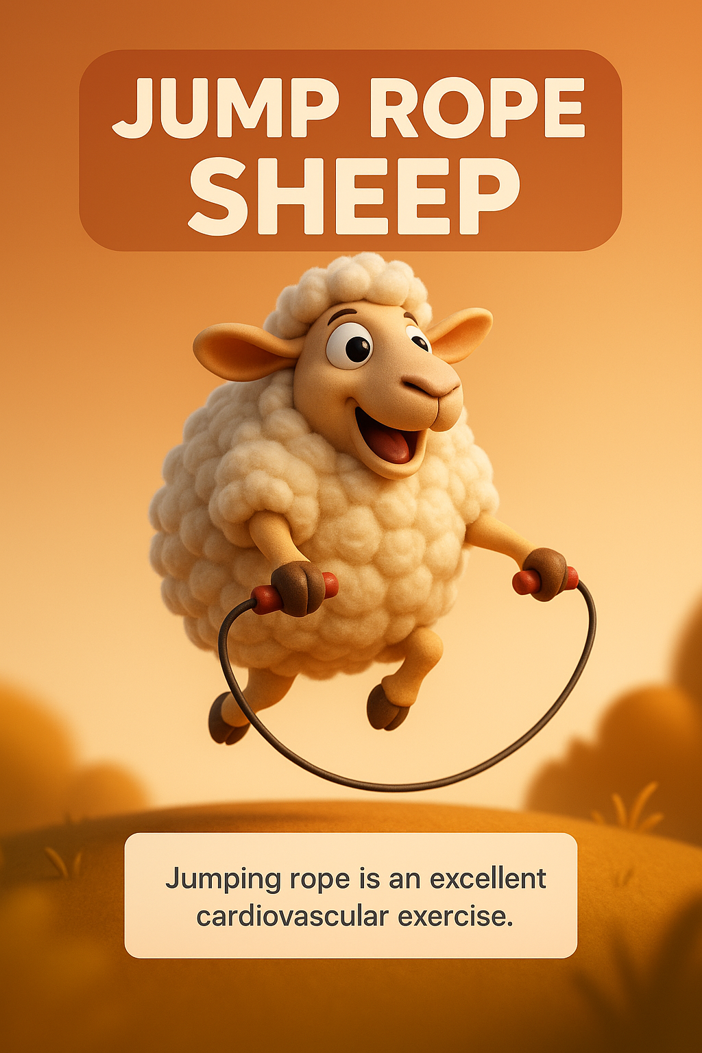 A whimsical illustration of a sheep joyfully jumping rope, ideal for promoting fitness and fun exercises. The warm color palette adds a cheerful vibe.