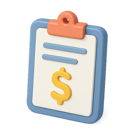 A stylized 3D clipboard icon featuring a dollar sign, ideal for financial or budgeting applications. The design combines playful colors and a modern aesthetic, suitable for digital interfaces.