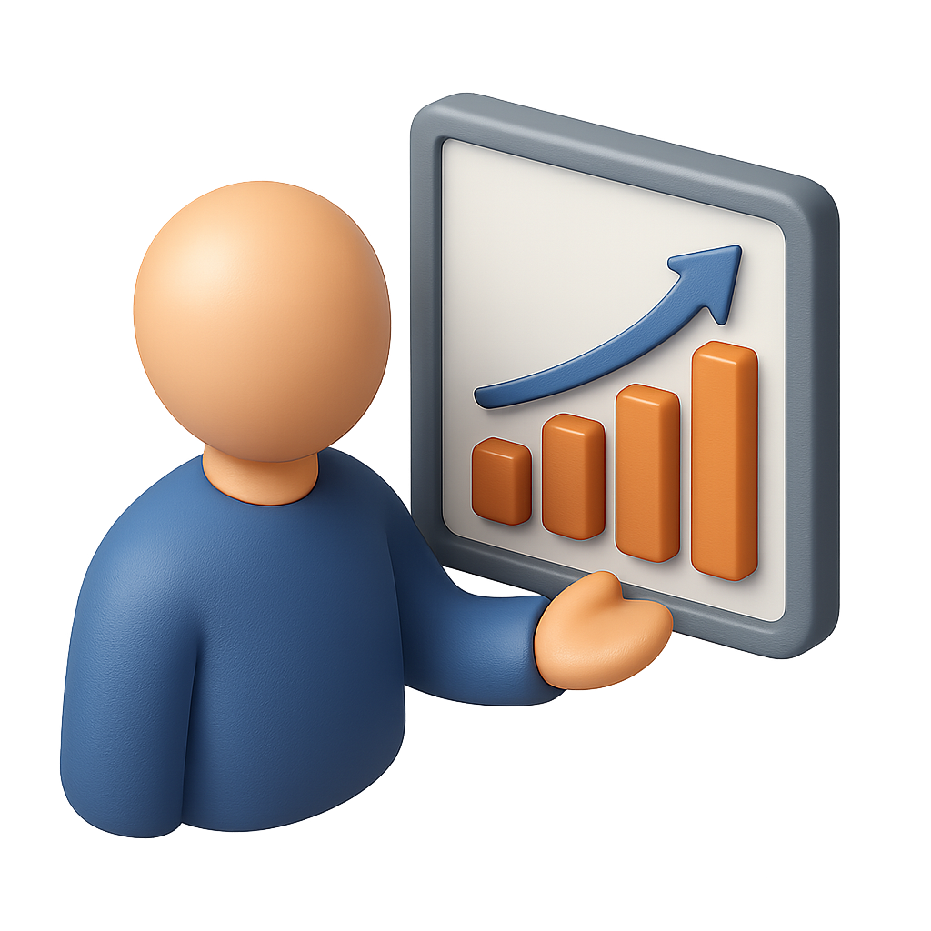 A 3D icon depicting a person presenting a growth chart with an upward trend. The figure has a simplistic design and is shown in a three-quarter view, emphasizing the isometric and volumetric style.