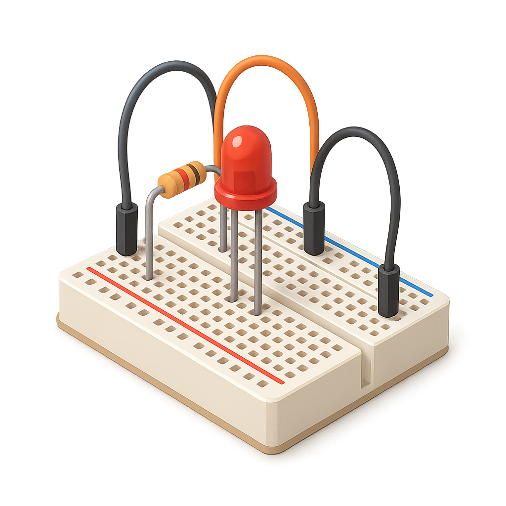 A 3D illustration of a breadboard with an LED and colorful wires. The icon is designed in an isometric view with a transparent background, emphasizing a volumetric feel.