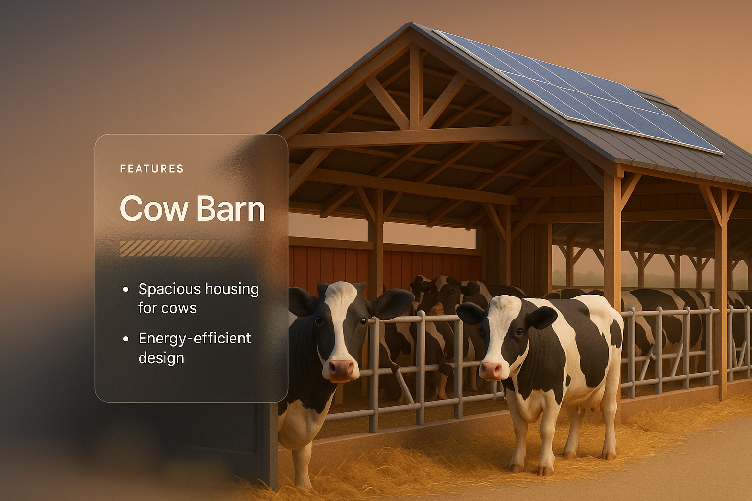 A detailed 3D illustration of a cow barn featuring cows and solar panels. The design includes informative text blocks with a dark overlay, enhancing the visual appeal.