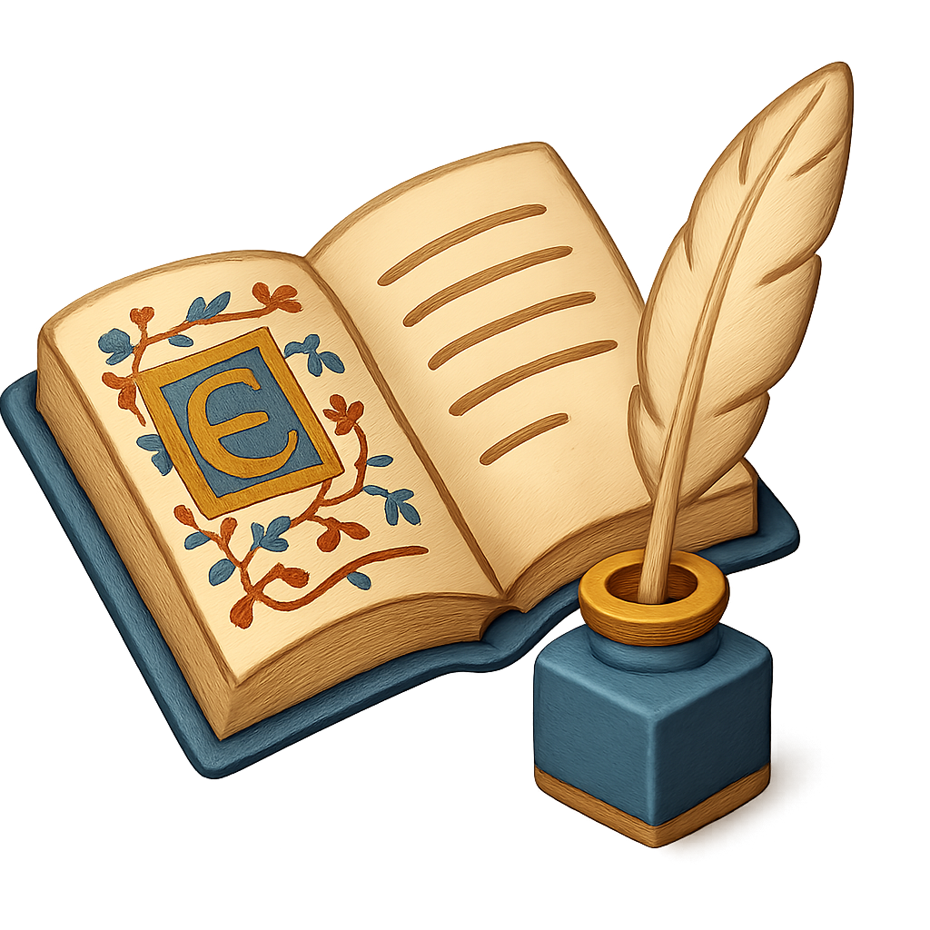 A beautifully designed 3D icon of an open manuscript with decorative elements and a feather quill, showcasing a rich, volumetric style against a soft gradient background.
