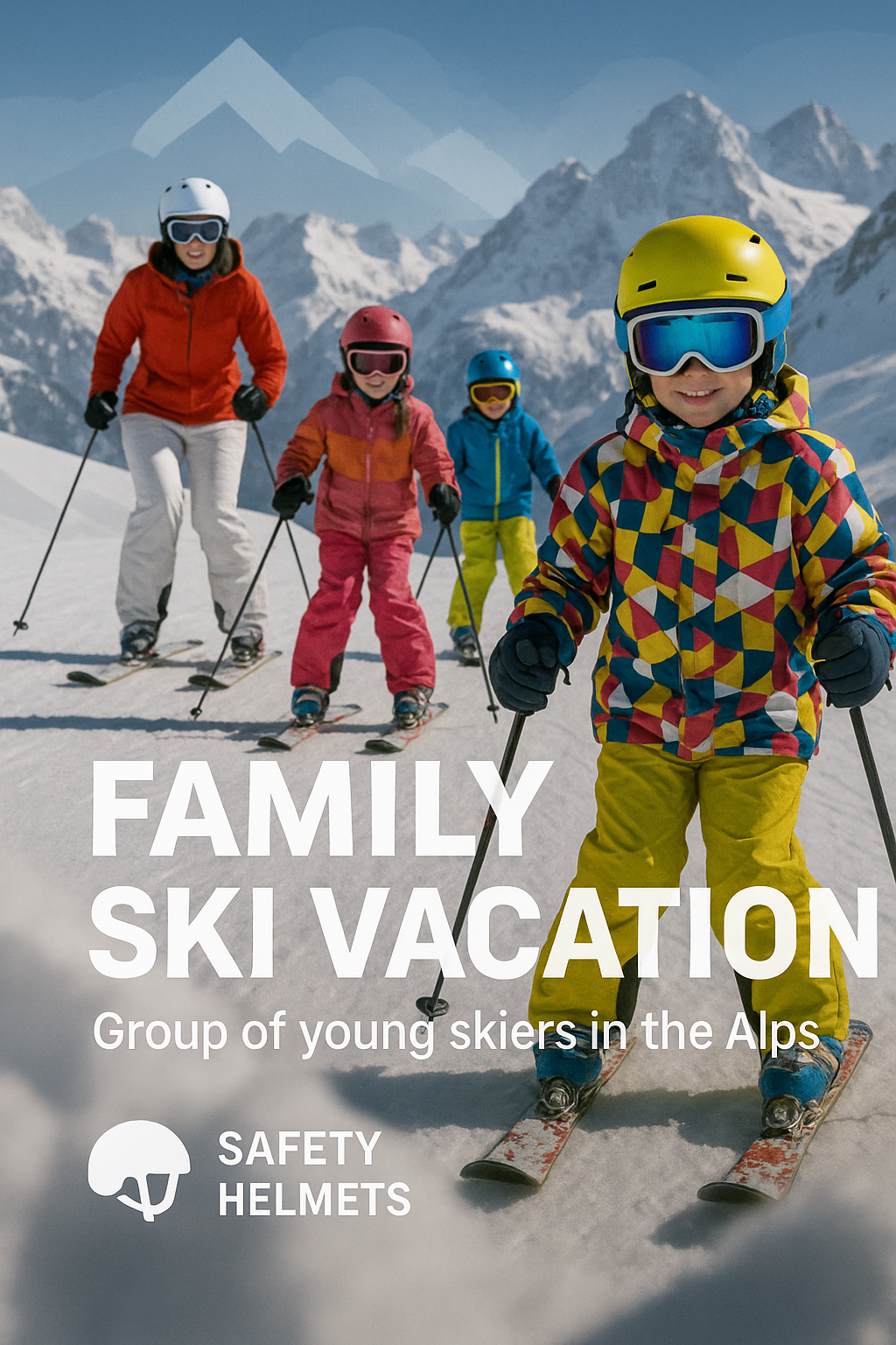 Vibrant family ski vacation image showcasing a group of young skiers in colorful attire on snow-covered slopes, perfect for winter sports promotion.