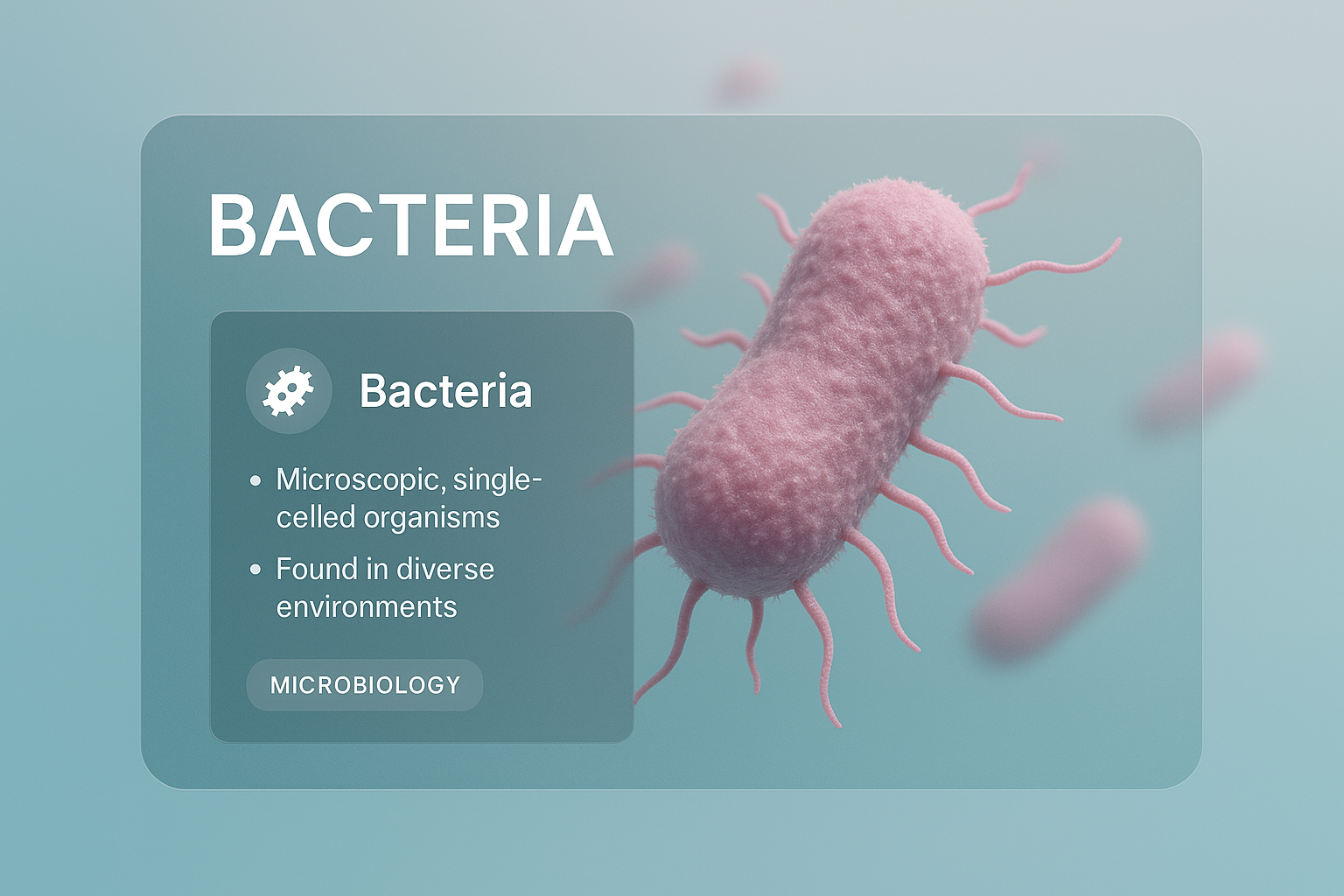 /Collection: /by davooda/Type: PNG/A detailed 3D illustration of bacteria, featuring a smooth gradient background. The image includes an informative overlay with the title, icon, and descriptive text about bacteria.