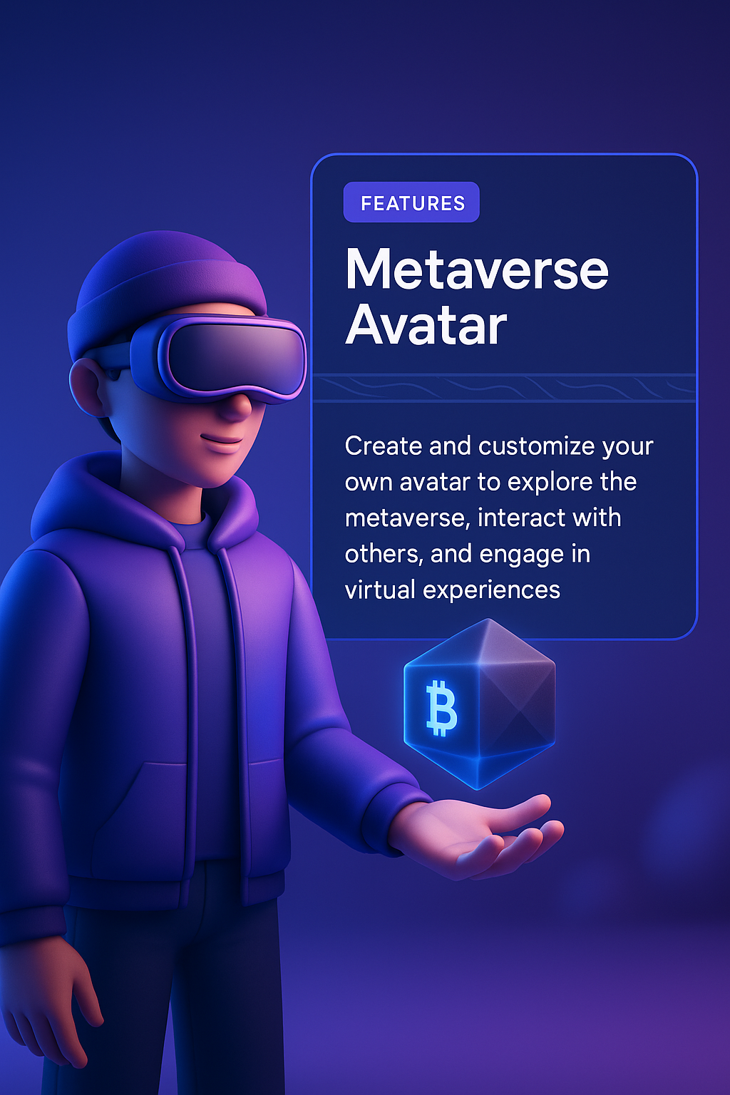 /Collection: /by davooda/Type: PNG/A 3D illustration of a metaverse avatar wearing virtual reality goggles, holding a floating crypto cube. The background features a smooth gradient, enhancing the futuristic vibe.