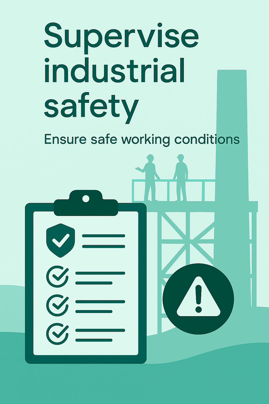 Informative infographic emphasizing industrial safety with checklist elements and a warning icon, designed for workplace safety training and awareness.