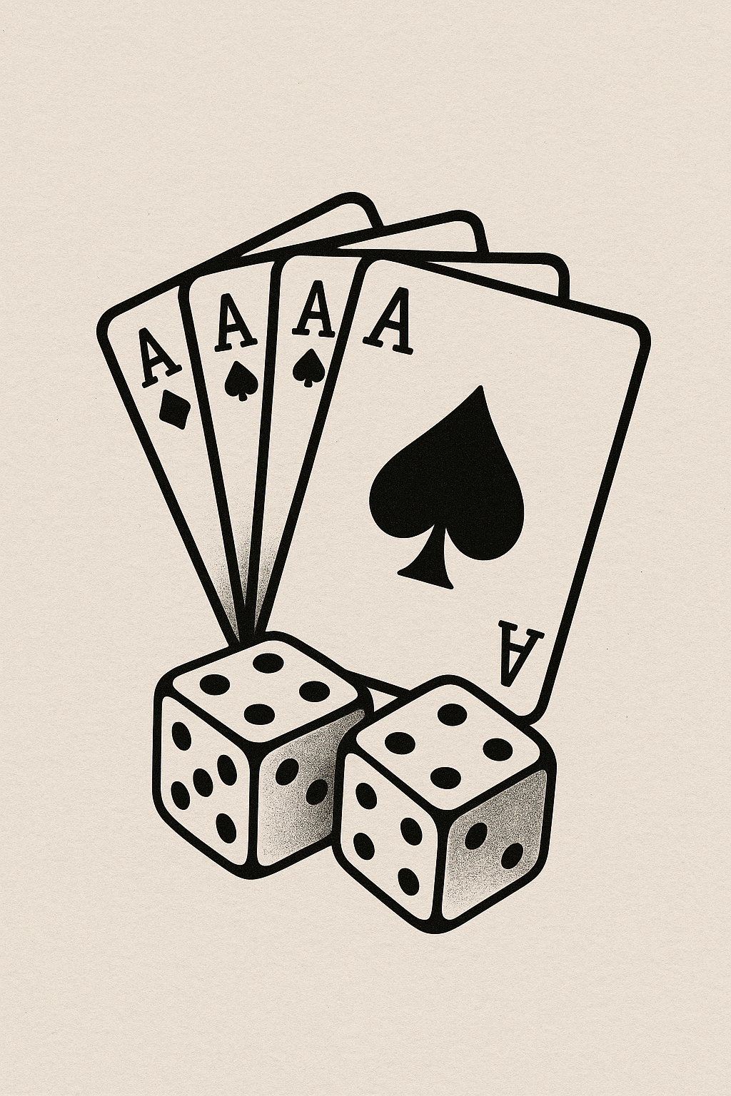 /Collection: /by davooda/Type: PNG/This image features a stylized illustration of playing cards and dice, ideal for gaming-themed content. The minimalist design emphasizes the elements of chance and strategy.