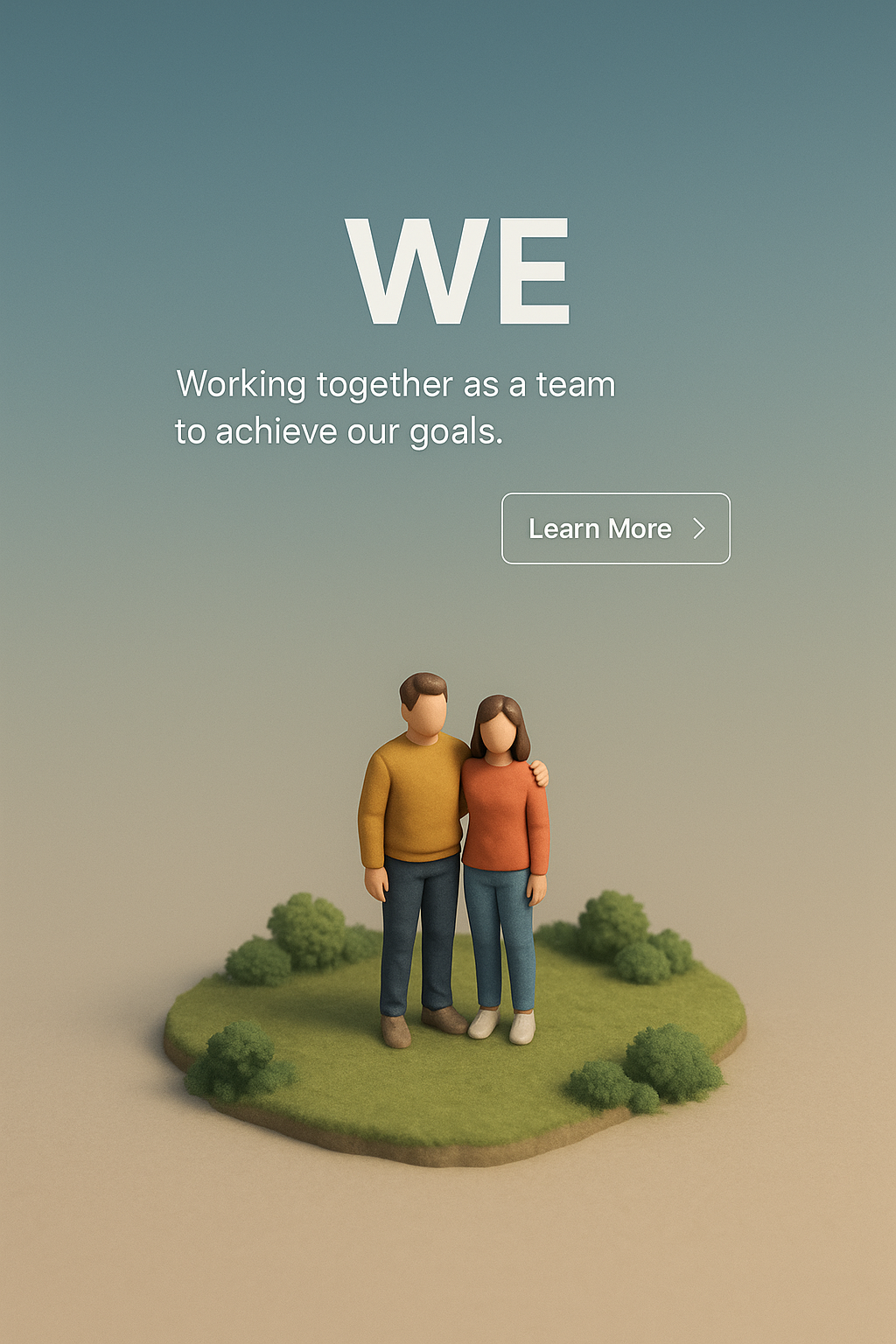 A minimalist 3D illustration showing a couple standing together on a small grassy patch. The background features a smooth gradient transitioning from light to solid color, emphasizing teamwork.