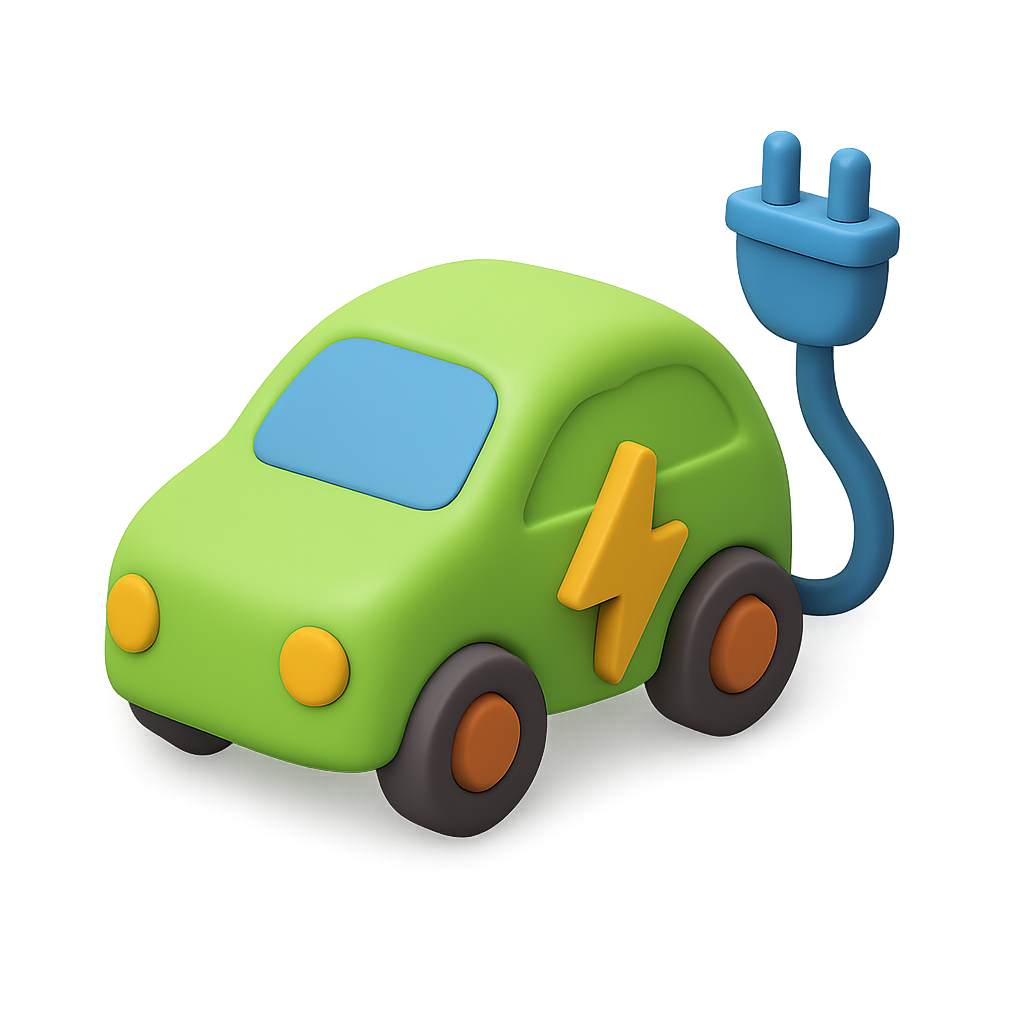 A vibrant 3D icon of an electric vehicle, featuring a green body, blue plug, and orange wheels, designed with a three-quarter view for a playful and modern look.