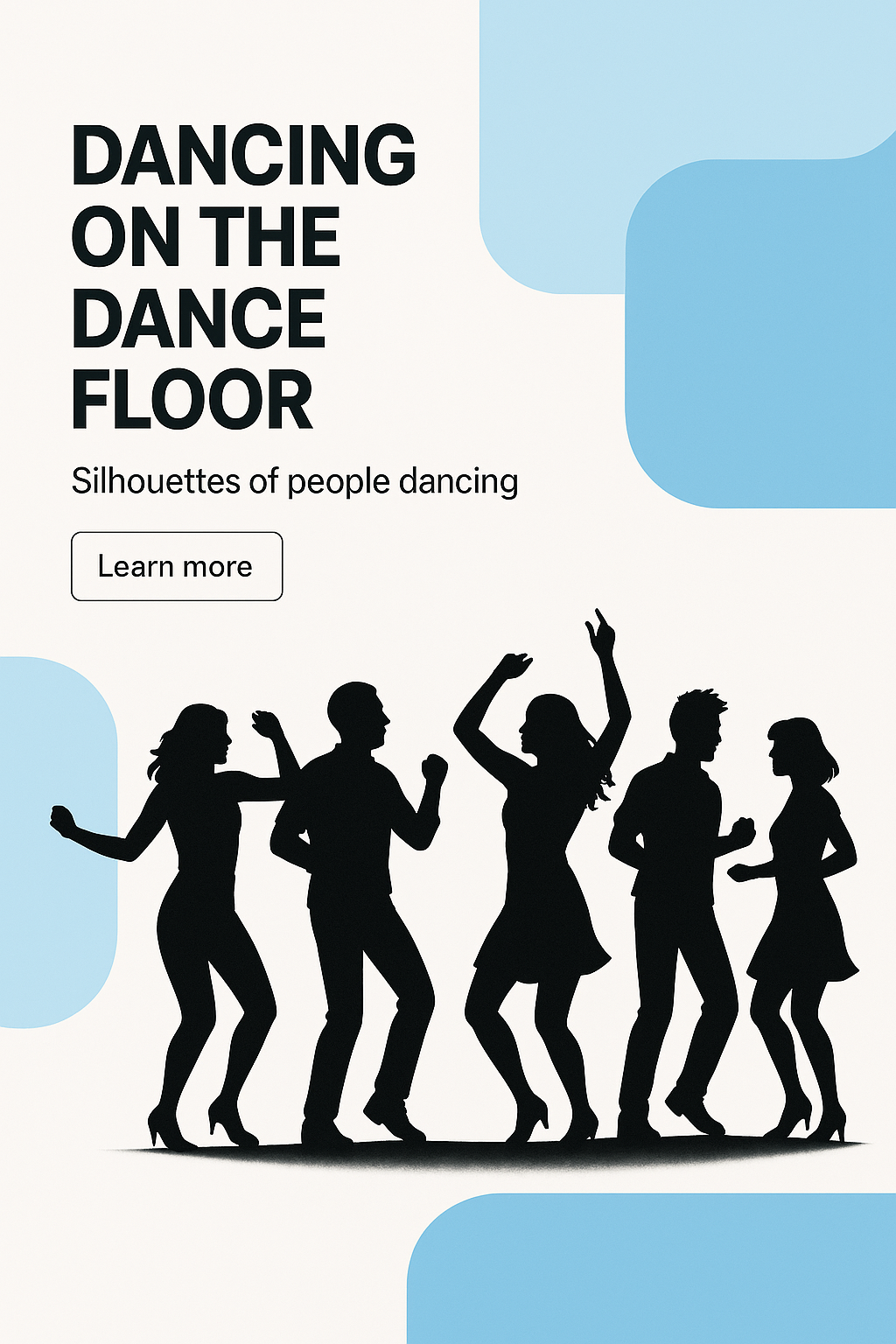 /Collection: /by davooda/Type: PNG/The image showcases silhouettes of people dancing against a vibrant geometric background. Bold typography enhances the modern, professional layout, featuring a call-to-action.