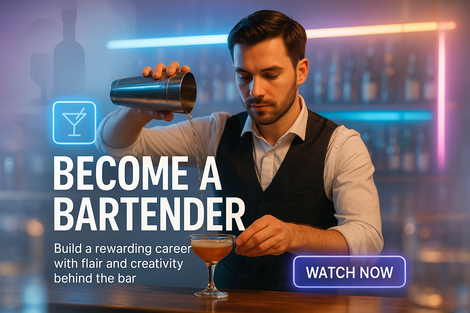 A vibrant promotional banner showcasing a bartender in action, perfect for attracting individuals interested in bartending careers. The modern design incorporates neon lighting elements to enhance appeal.