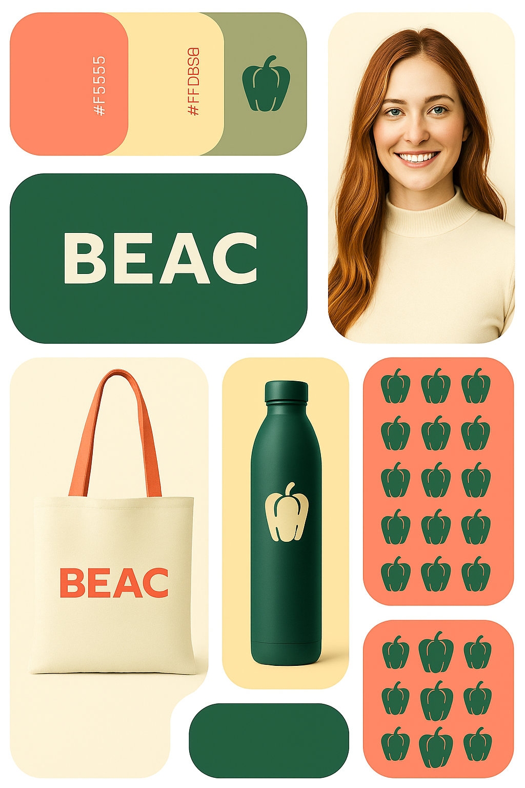 /Collection: /by davooda/Type: PNG/This image features a modern brand redesign showcasing a smiling woman, colorful geometric shapes, and products like a tote bag and water bottle. The design emphasizes fresh colors and playful illustrations.