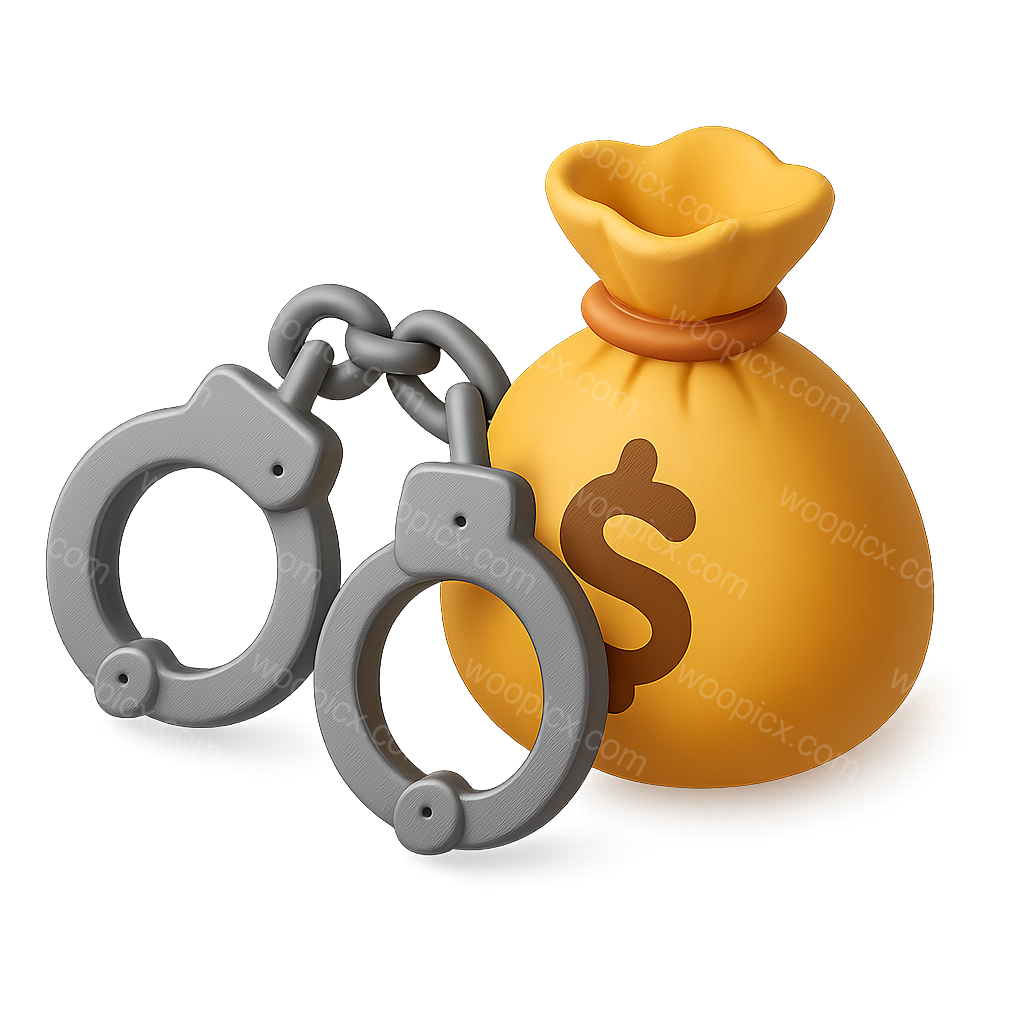 /Premium/Collection: /by davooda/Type: PNG/A 3D icon depicting handcuffs beside a money bag with a dollar sign. The image features a transparent background and a three-quarter view, enhancing its volumetric appearance.