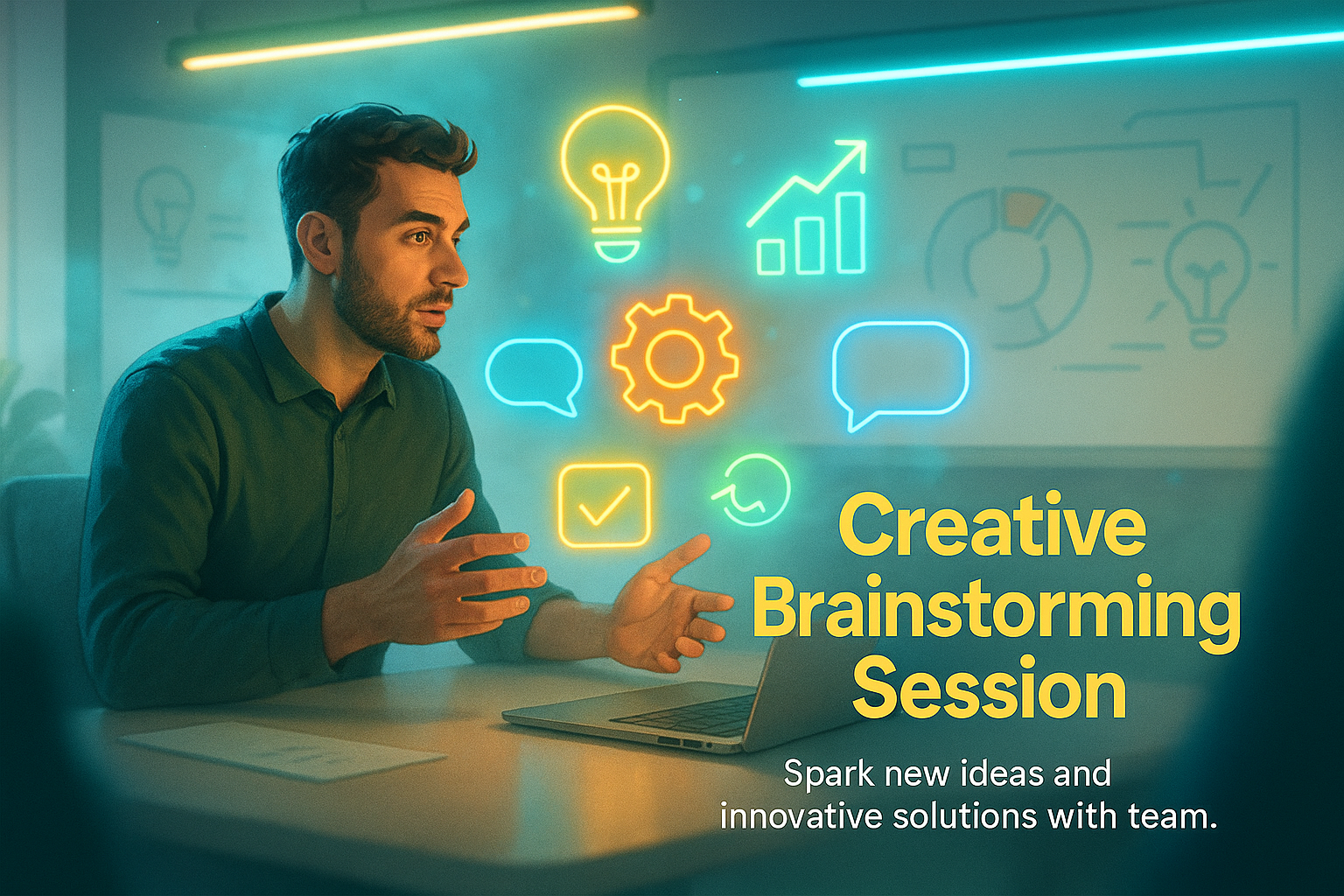 A visually appealing image depicting a man engaged in a creative brainstorming session, featuring vibrant neon icons that symbolize ideas and collaboration, ideal for team-building or innovation-focused content.
