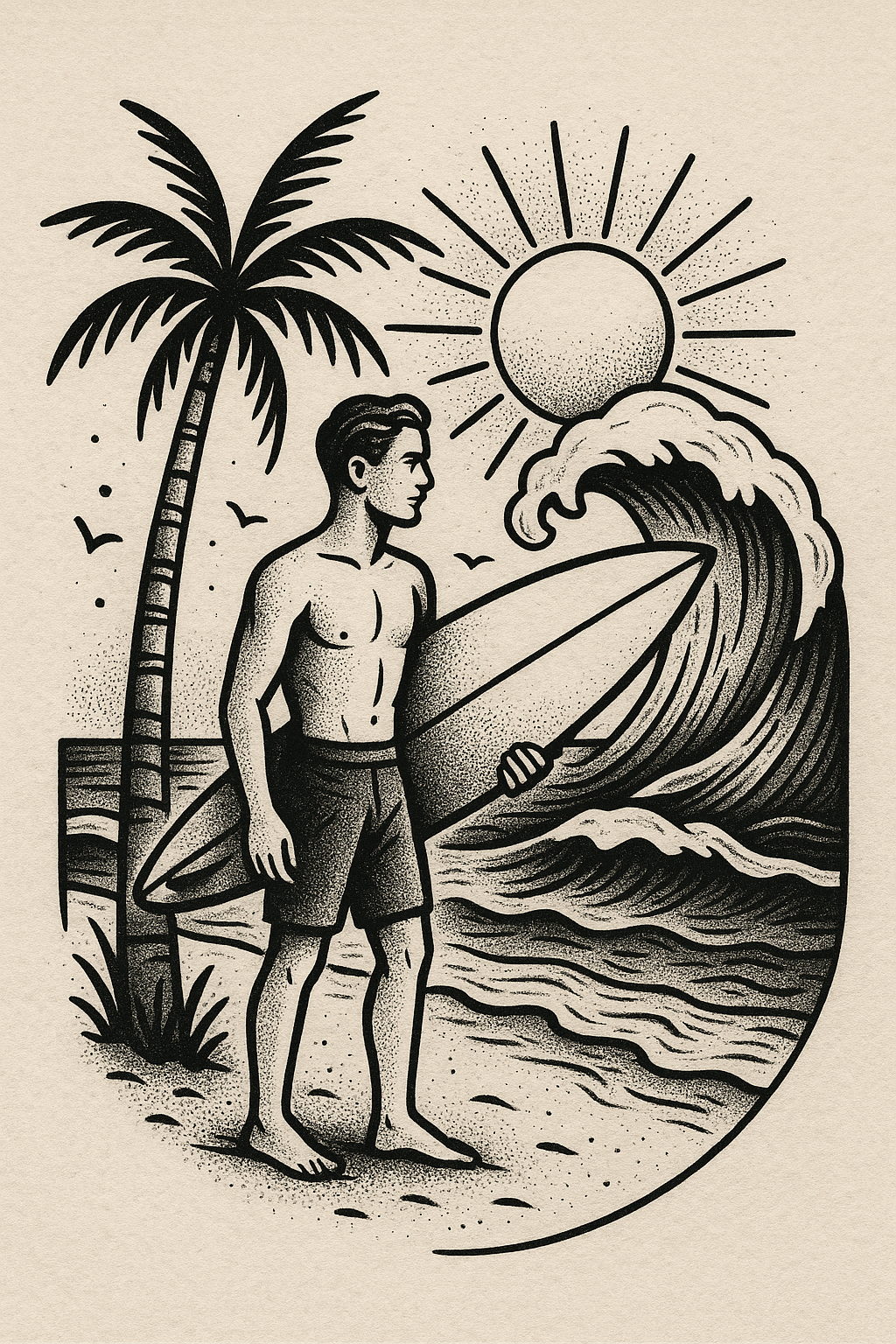 A black and white illustration depicting a surfer with a board, palm tree, and waves. Ideal for surf culture-themed designs and merchandise.