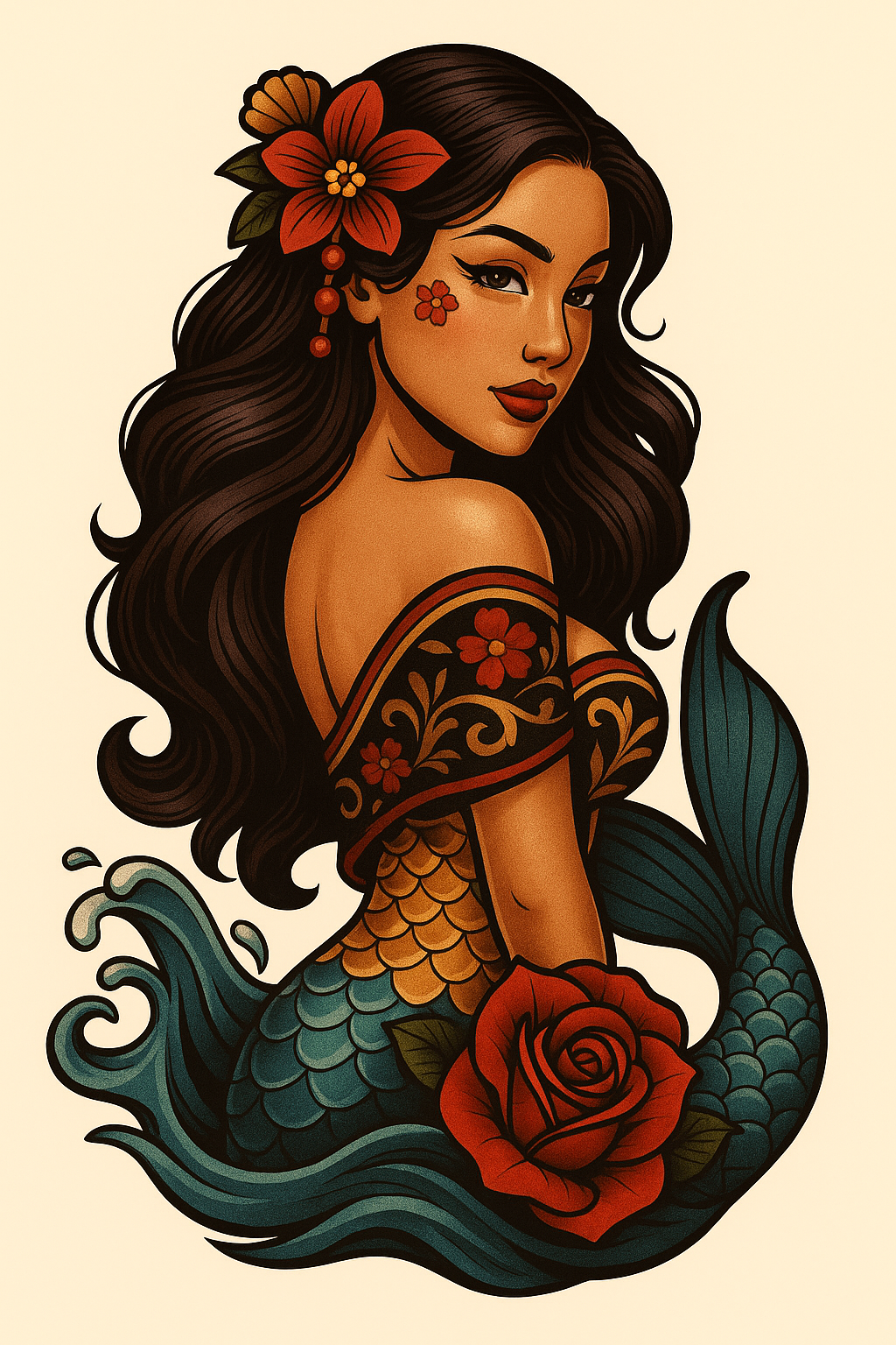 This image features a glossy, stylized mermaid with flowing hair and floral accents. The composition resembles a classic tattoo with vibrant colors and detailed elements, set against a non-transparent background.
