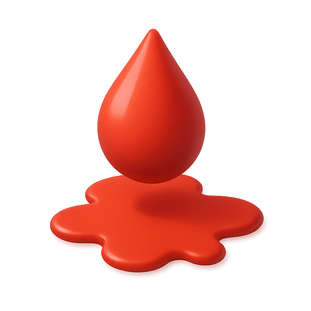 /Collection: /by davooda/Type: PNG/A striking 3D icon representing a blood droplet, designed with a glossy finish and placed on a puddle of red liquid. The object is rendered in a three-quarter view, showcasing its volumetric depth against a soft gradient background.