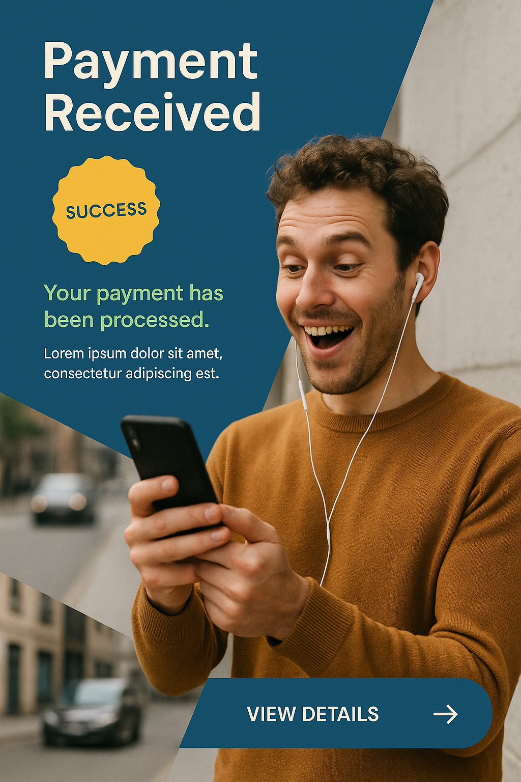 /Collection: /by davooda/Type: PNG/A man looks surprised and pleased as he receives a payment notification on his smartphone. The visual design includes layered elements, vibrant colors, and an engaging layout.