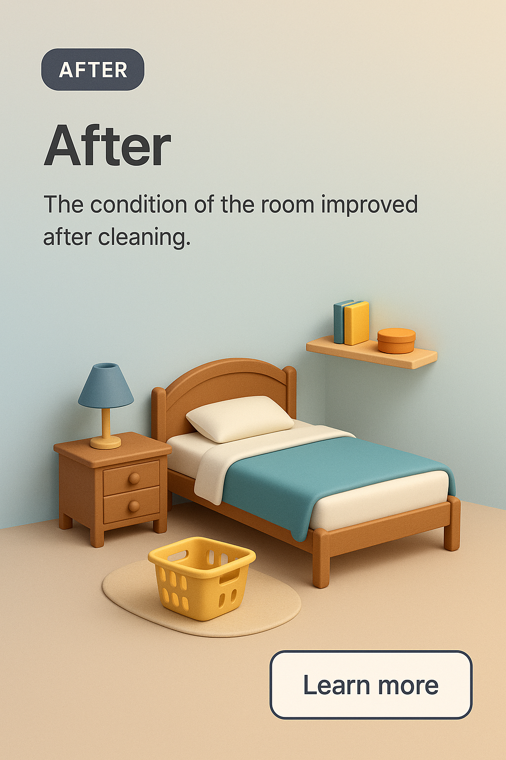 A realistic 3D illustration of a tidy bedroom featuring a bed, nightstand, and a laundry basket. The design showcases a soft gradient background and clear text elements.